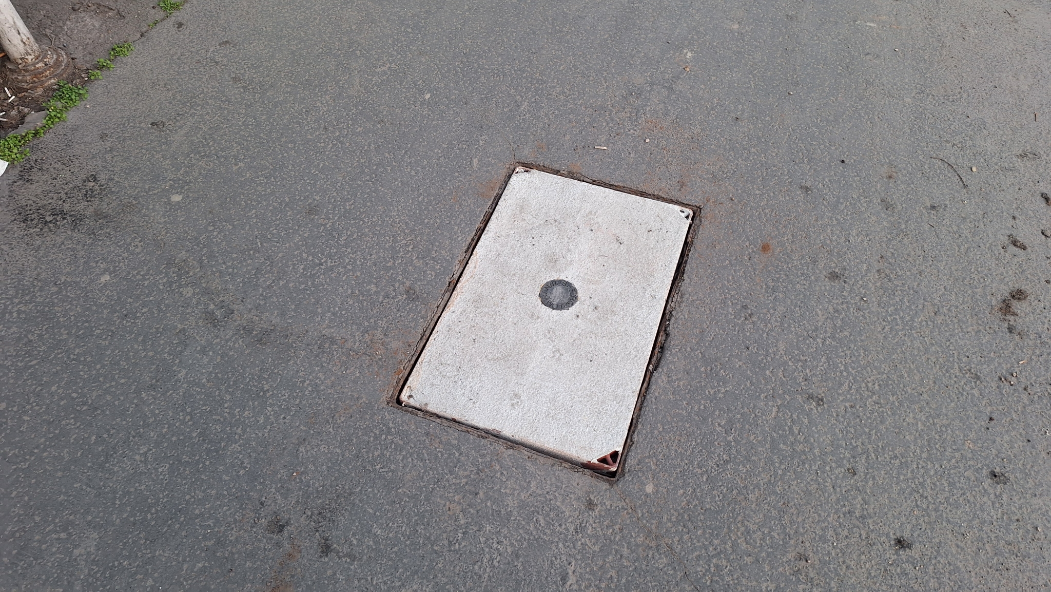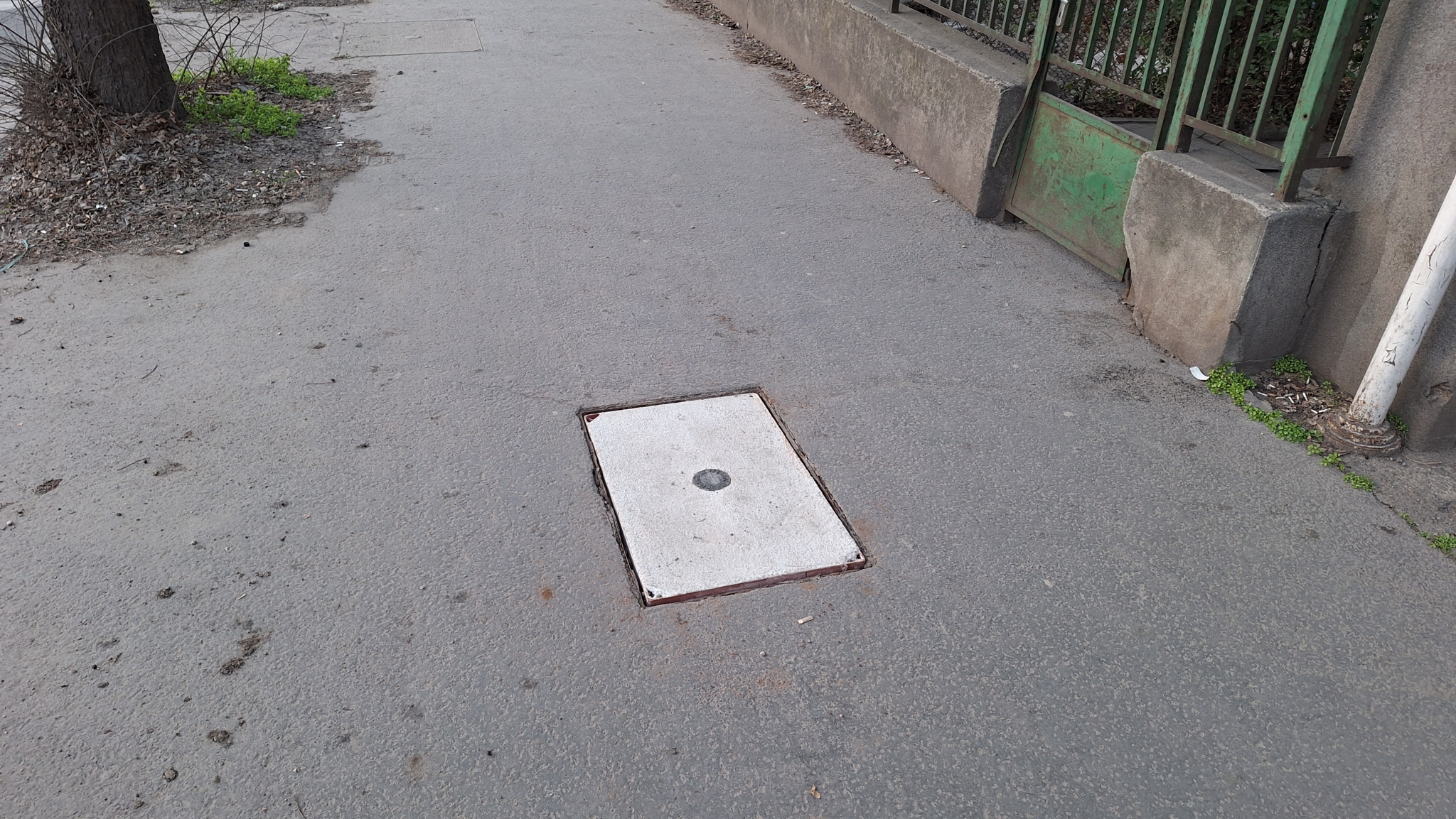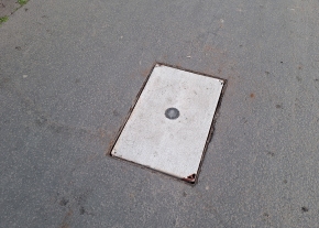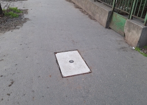 A Hungária körút 71. előtt van egy szétporladt, kopott aknafedél.