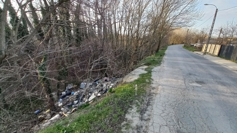 Az út melletti rézsűről nagy mennyiségű hulladékot borítottak az erdőbe a Zodony utcai kereszteződéshez közel.