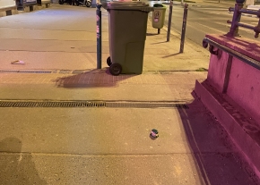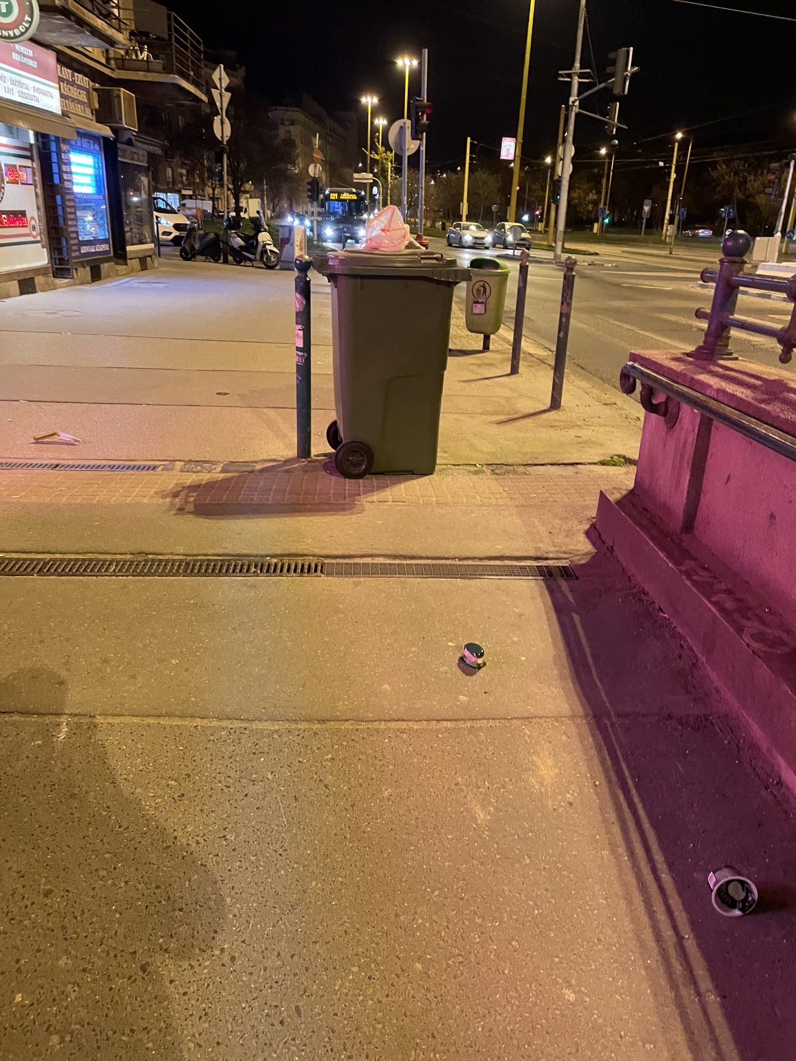 A Jakobinusok tere és az Alkotás utca sarkán, a Déli Pályaudvar lejárója mellett egy kuka rendszeresen kint van az utcán, nemcsak a szemétszállítás napján. A kuka gyakran a járda közepére kerül, akadályozva a közlekedést, és körülötte folyamatosan szemét halmozódik.