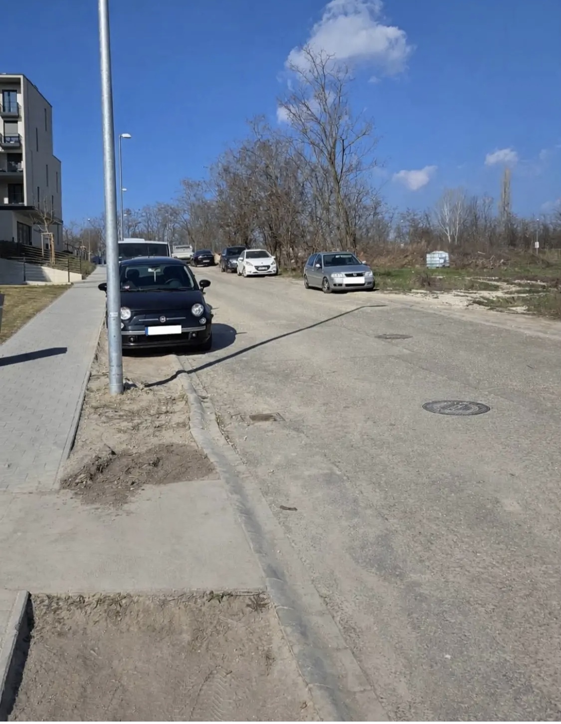 A XI. kerületben, az Ásólúd utcában rendszeresen a járda és az út közötti földes/zöld sávra parkolnak az autók. Más utcákban ez füves rész, itt már teljesen kikopott és a földet is “kiásták”. A nap minden szakaszában es a z utcán végig mindneki így áll, bármikor ellenőrizhető.