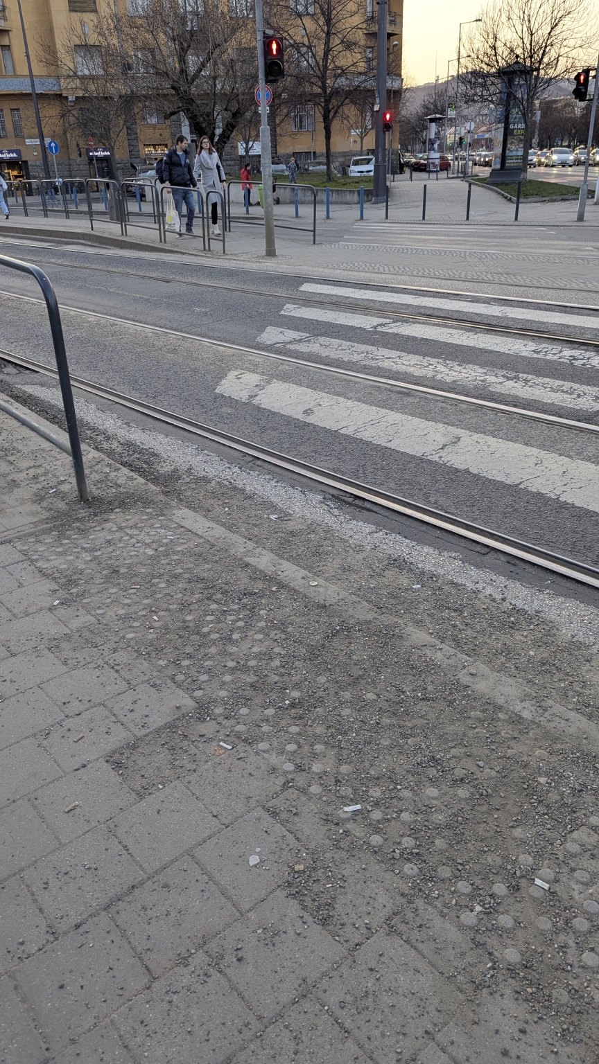 Legyenek szívesek feltakarítanina kavics és törmelékhalmot a villamosmegálló tövéből és az a melletti gyalogátkelőhely felületéről