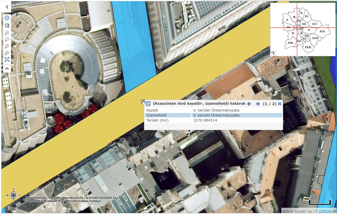 „A tárgyi útszakasz nem tartozik a Társaságunk által üzemeltetett úthálózathoz. A terület illetékes kezelője nyilvántartásunk szerint Budapest Főváros V. kerület Belváros-Lipótváros Önkormányzata. (lásd: csatolt kép a bejelentéshez a kezelői és üzemeltetői viszonyokról)”