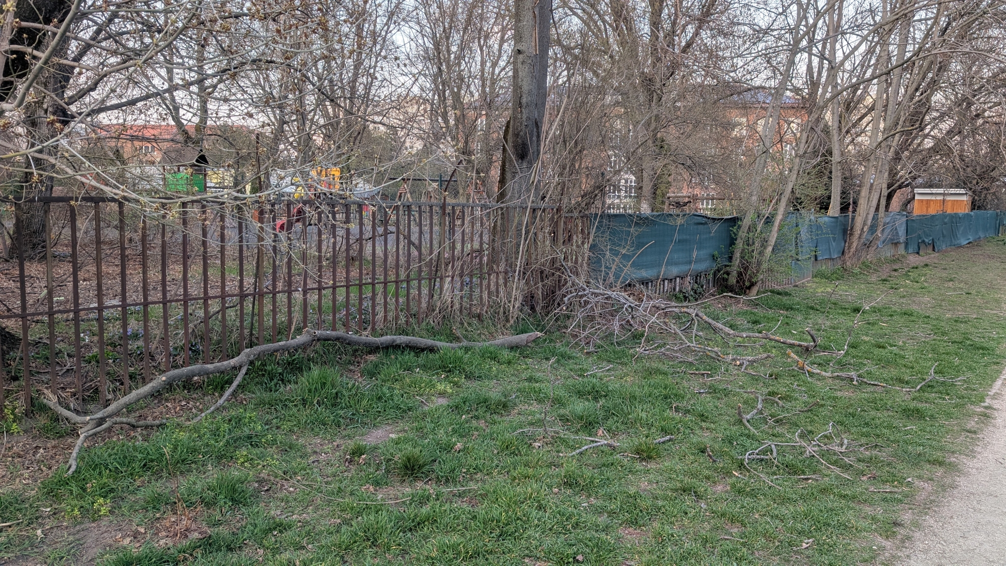 A Váradi utcai kormányhivatal mögött, az óvoda mellett egy adag faág várja az elszállítást.