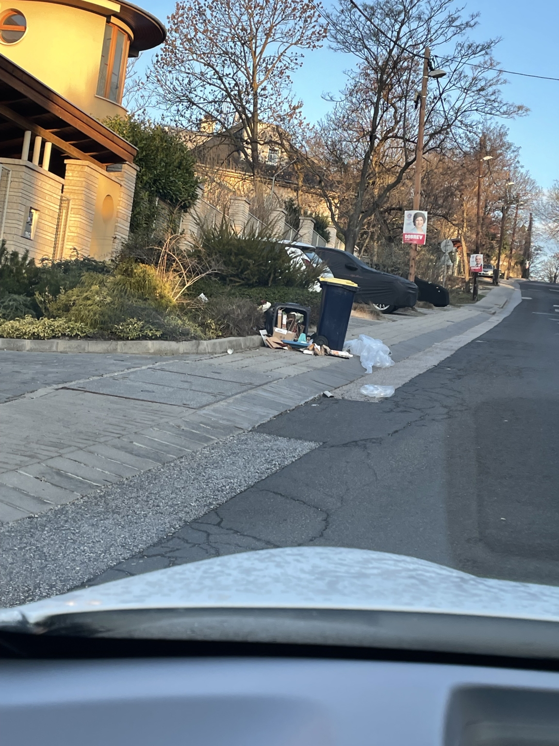 Mártonhegyi úton a vaddisznók rendszeresen felborítják a kukákat és széthordják a szemetet.