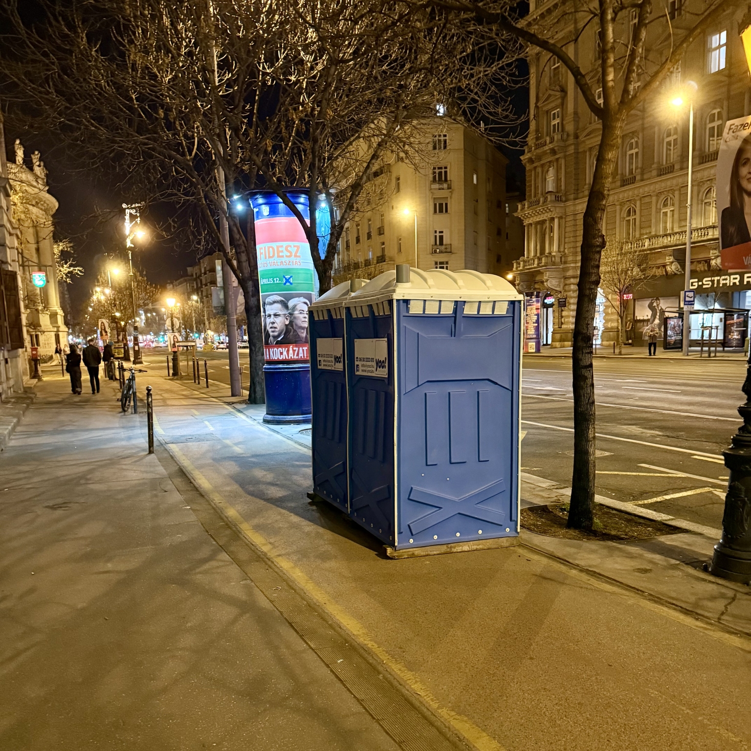A Bajcsy-Zsilinszky úti kerékpárútra mobil WC-ket telepítettek. Az egyik sávot teljesen elfoglalják de még a másikra is átlógnak. Veszélyre figyelmeztető jelölés nincsen egyik oldalon sem.