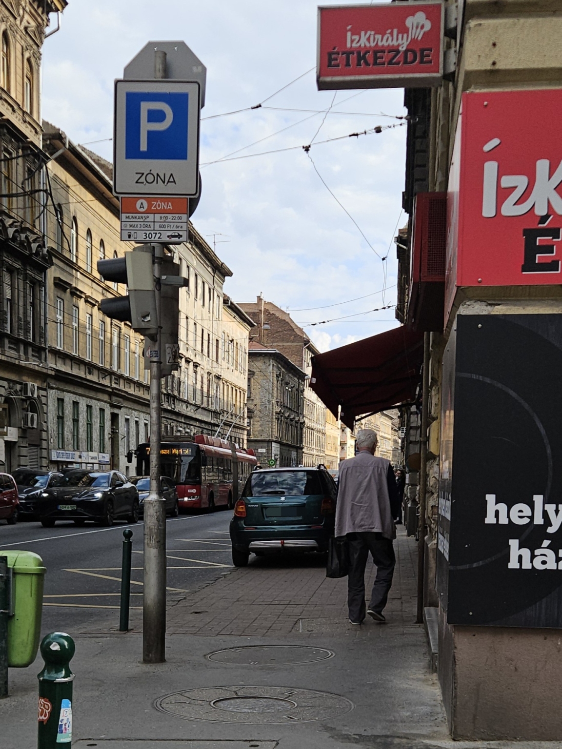 Az Izabella utcai trolimegálló elején egy parkoló zónát jelölő tábla van kihelyezve.