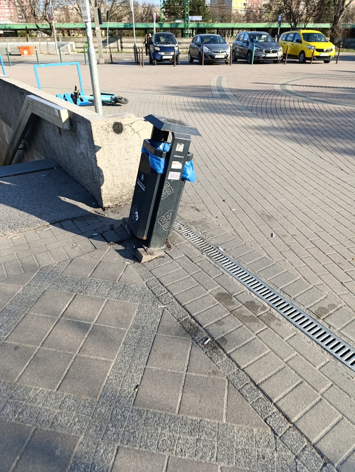 A békásmegyeri aluljáró Csobánka tér felőli oldalán a kuka kiszakadt a térkőből
