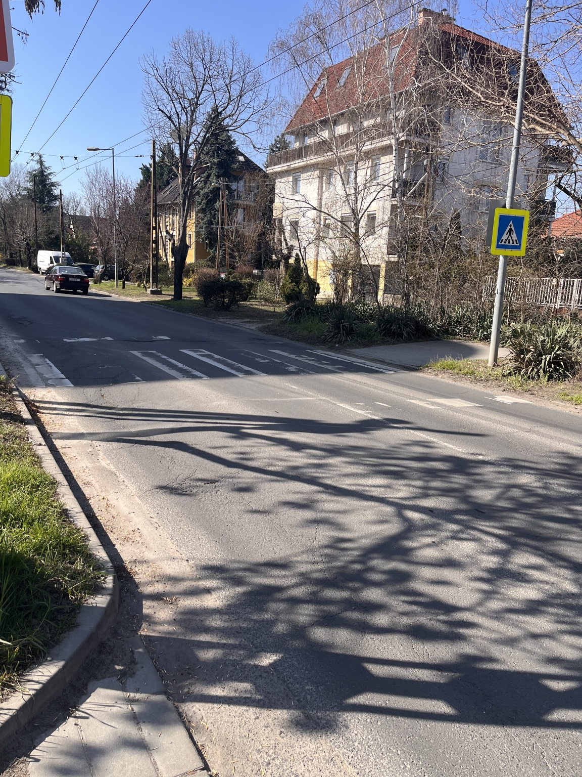 A gyalogos-átkelőhelyet jelző útburkolati jel, a felfestés félig lekopott ezért az autók nehezen veszik észre, ezt újra kellene festeni.
