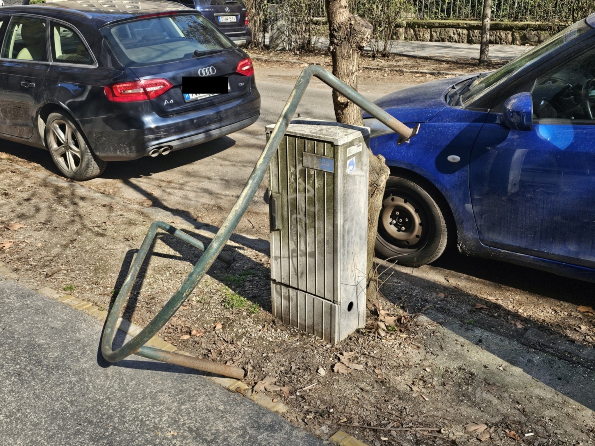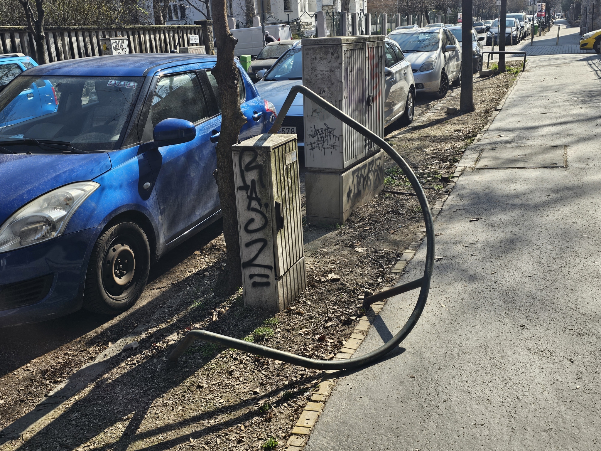 14. kerület, Cházár András utca 12. elött az egyik fa védőkeretét kidöntötték.