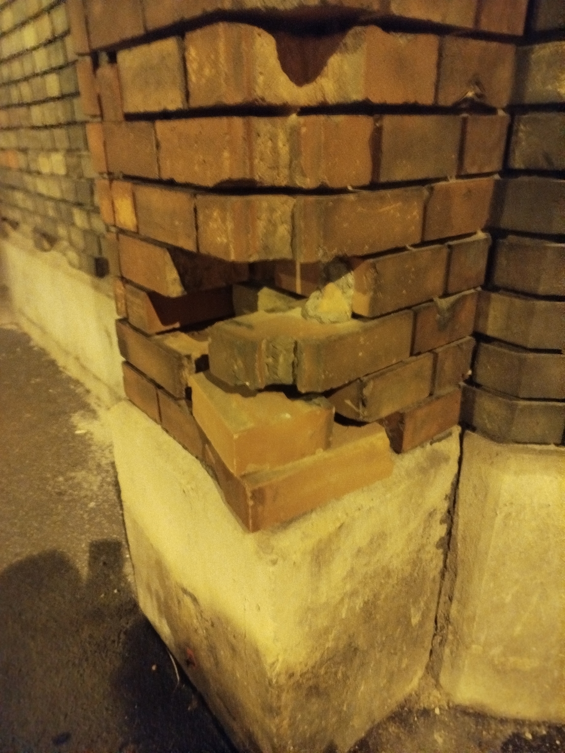 Az épület homlokzatáról szemmagasságban hiányzik a tégla.