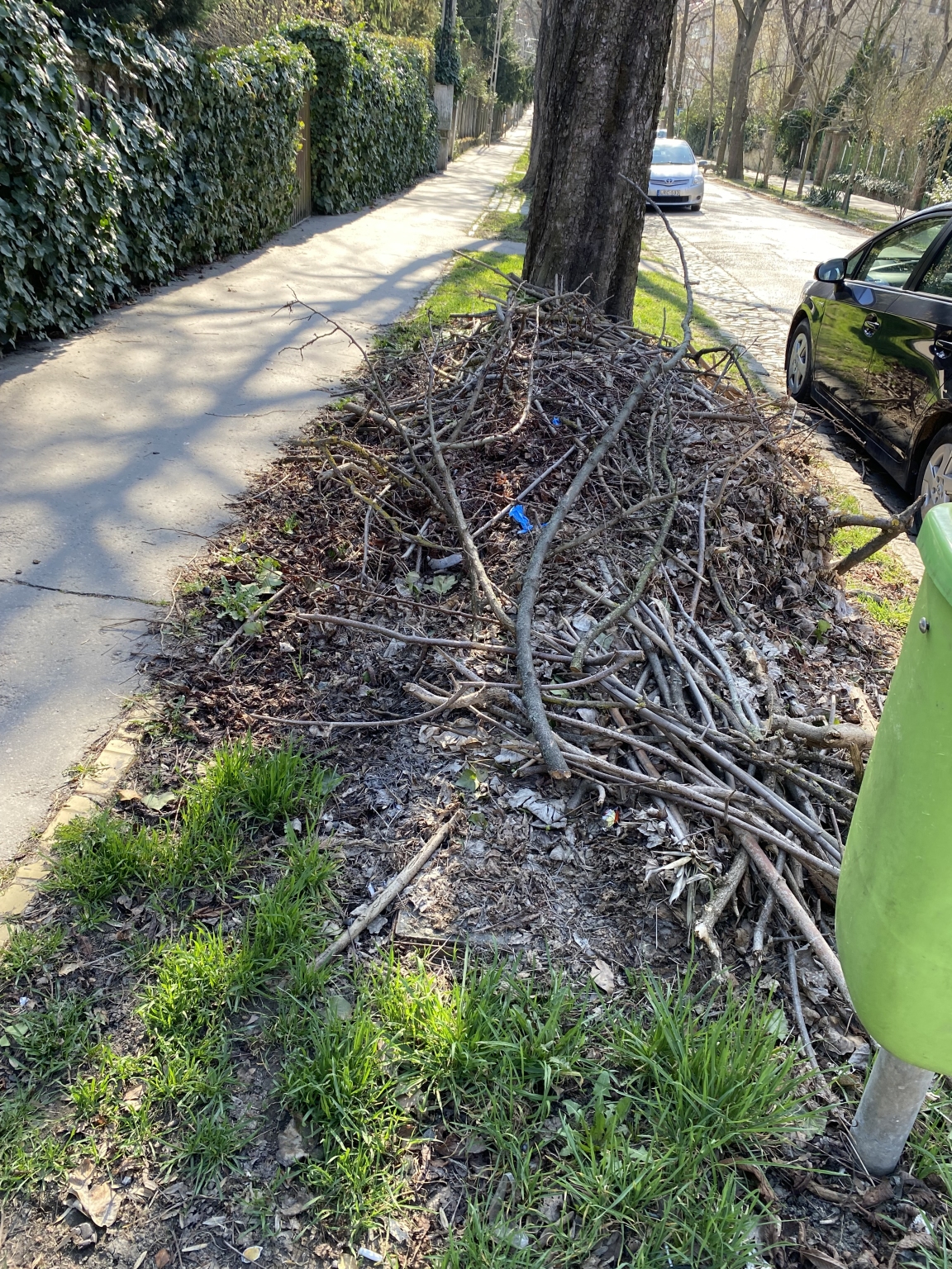 Nagy mennyiségű összehordott zöldhulladék található a járda mellett. Kérem szállítsák el.