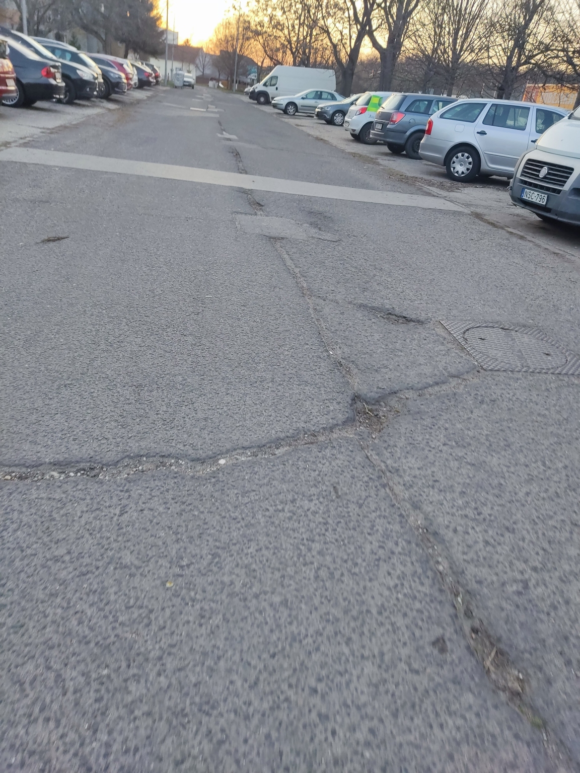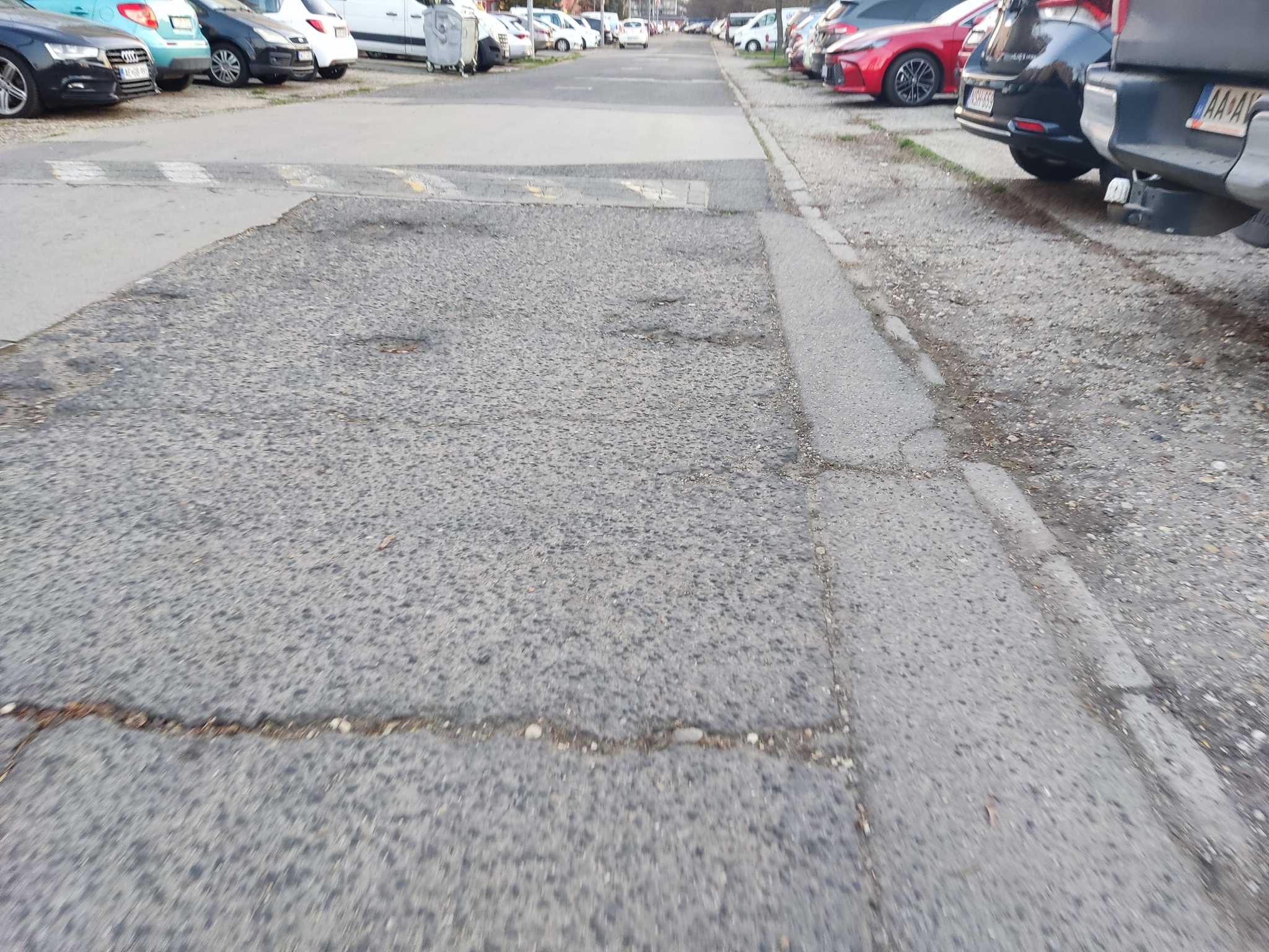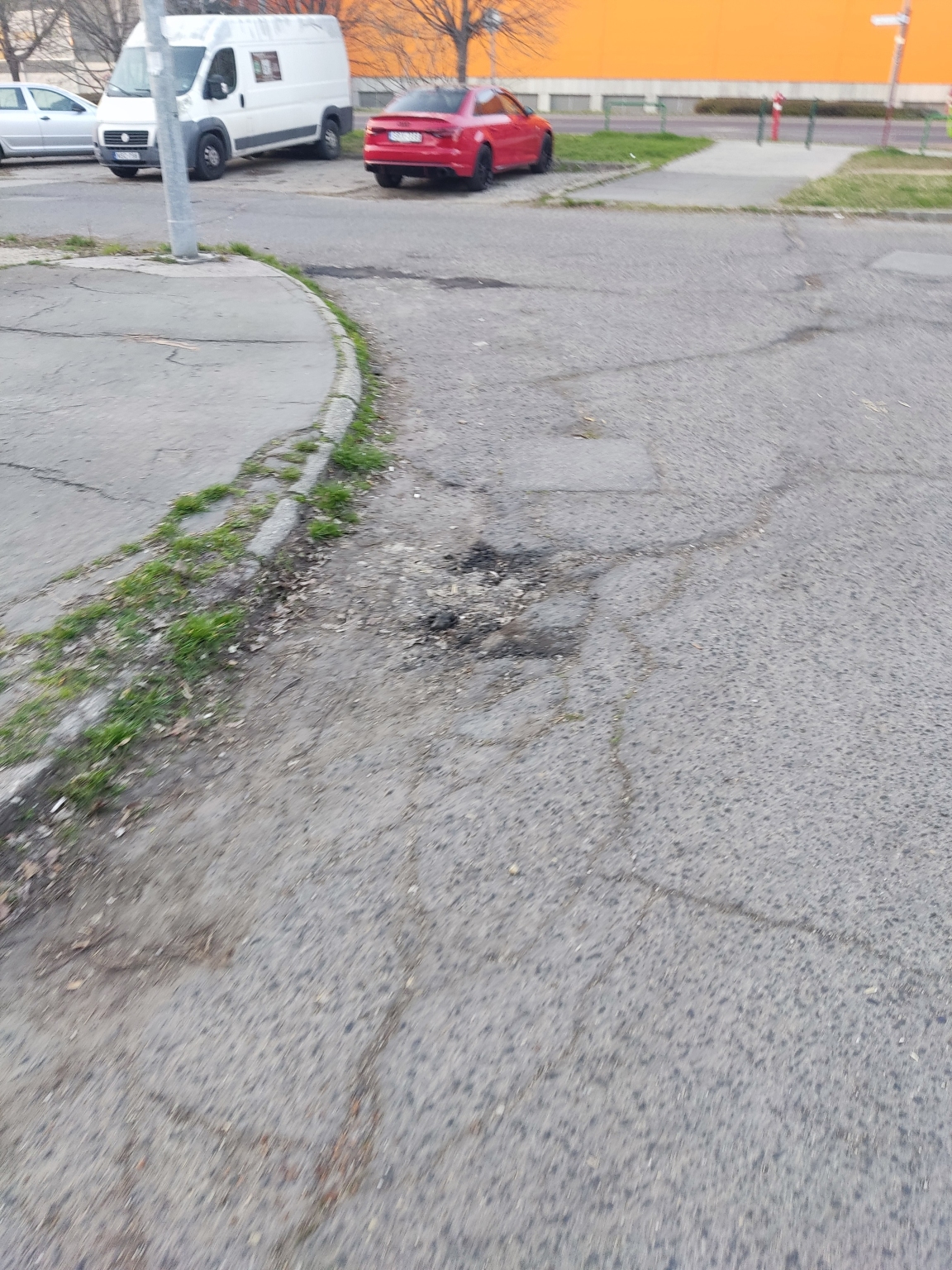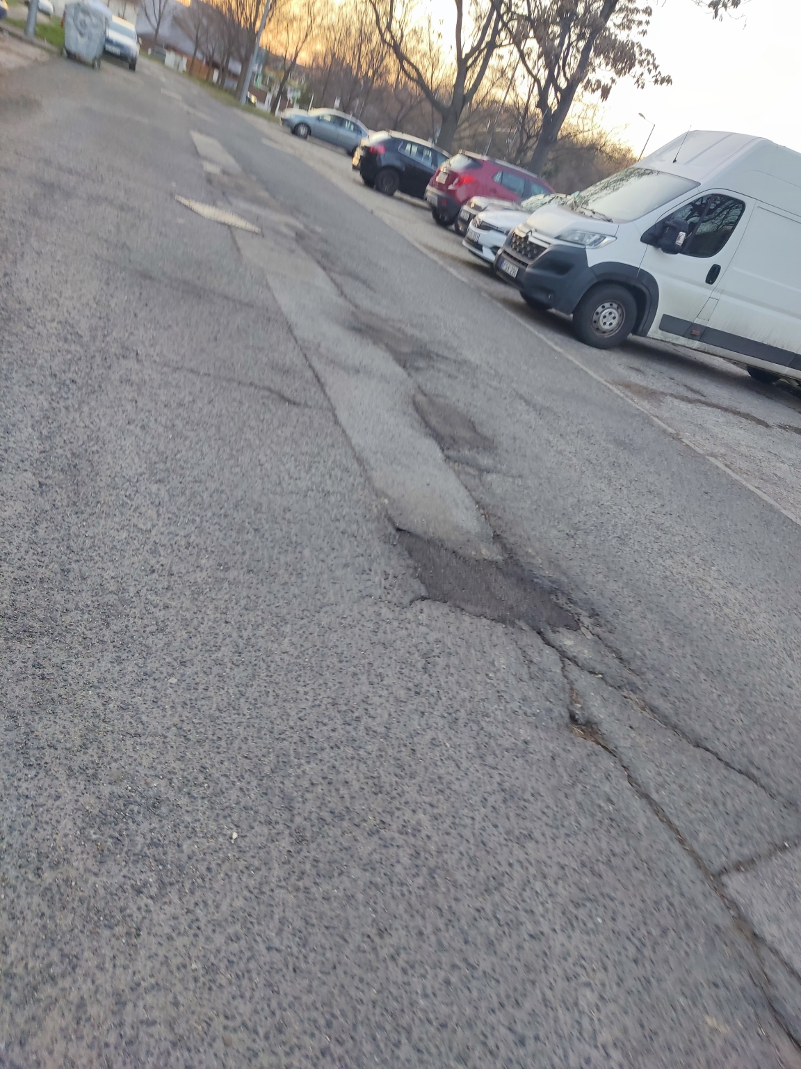 Kátyúk a lakótelepen. Kérjük a kátyúk megszüntetését a jelzett szakaszon. Korábban néhány javítása megtörtént, de számos kátyú található még a területen, több, jelentős mélységű, egy víznyelő és környéke is érintett.