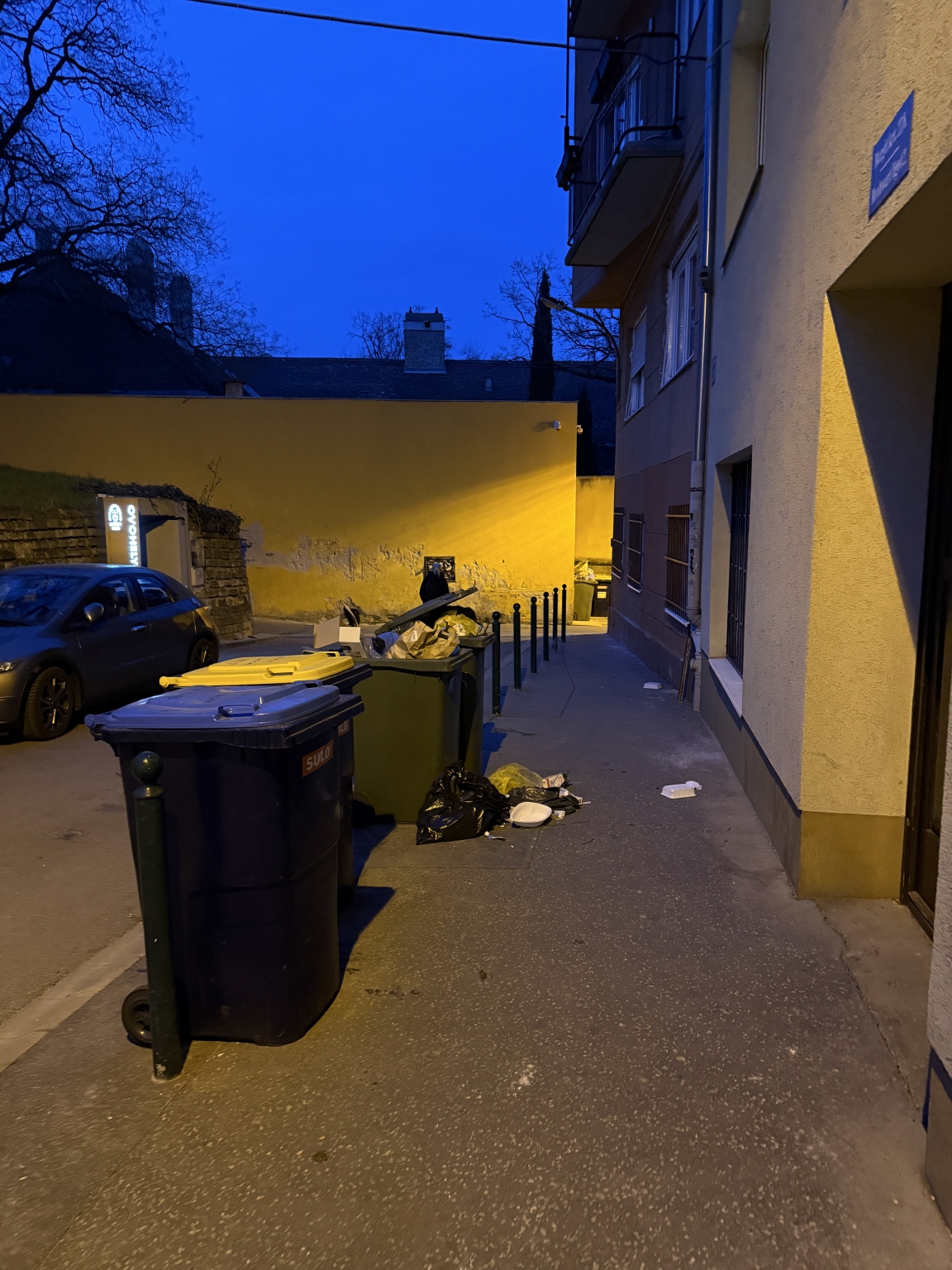 Szemeteskukák tartalmát a járdára és az autók közé szórták