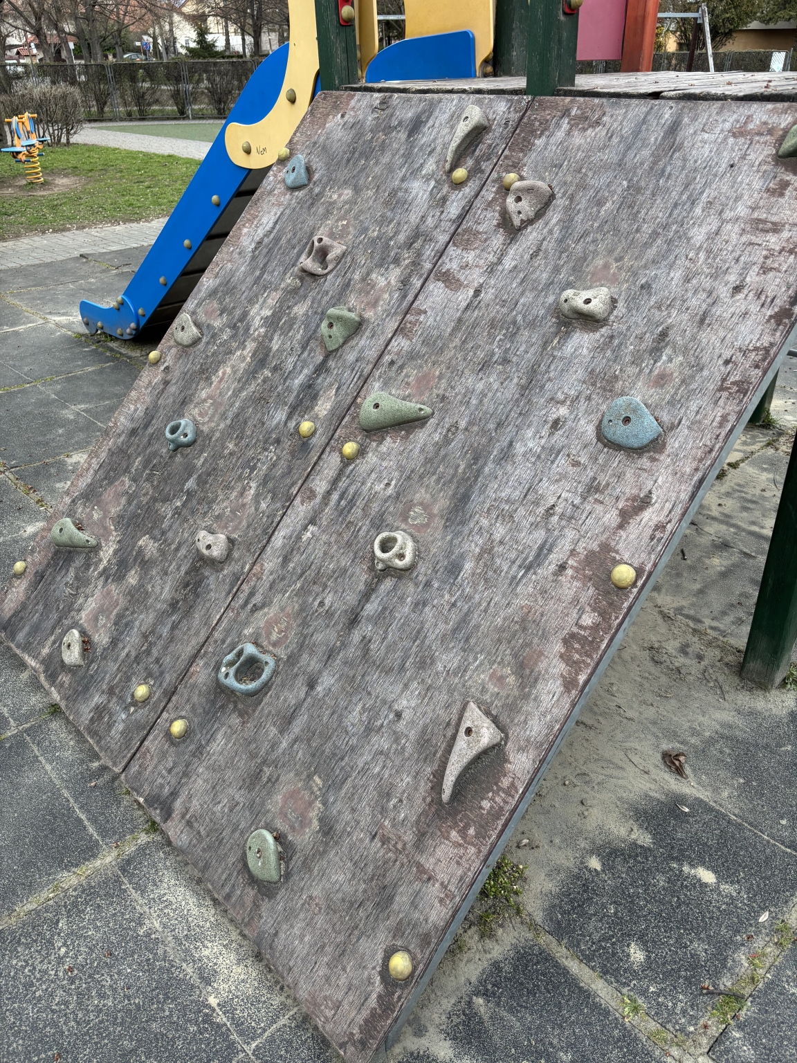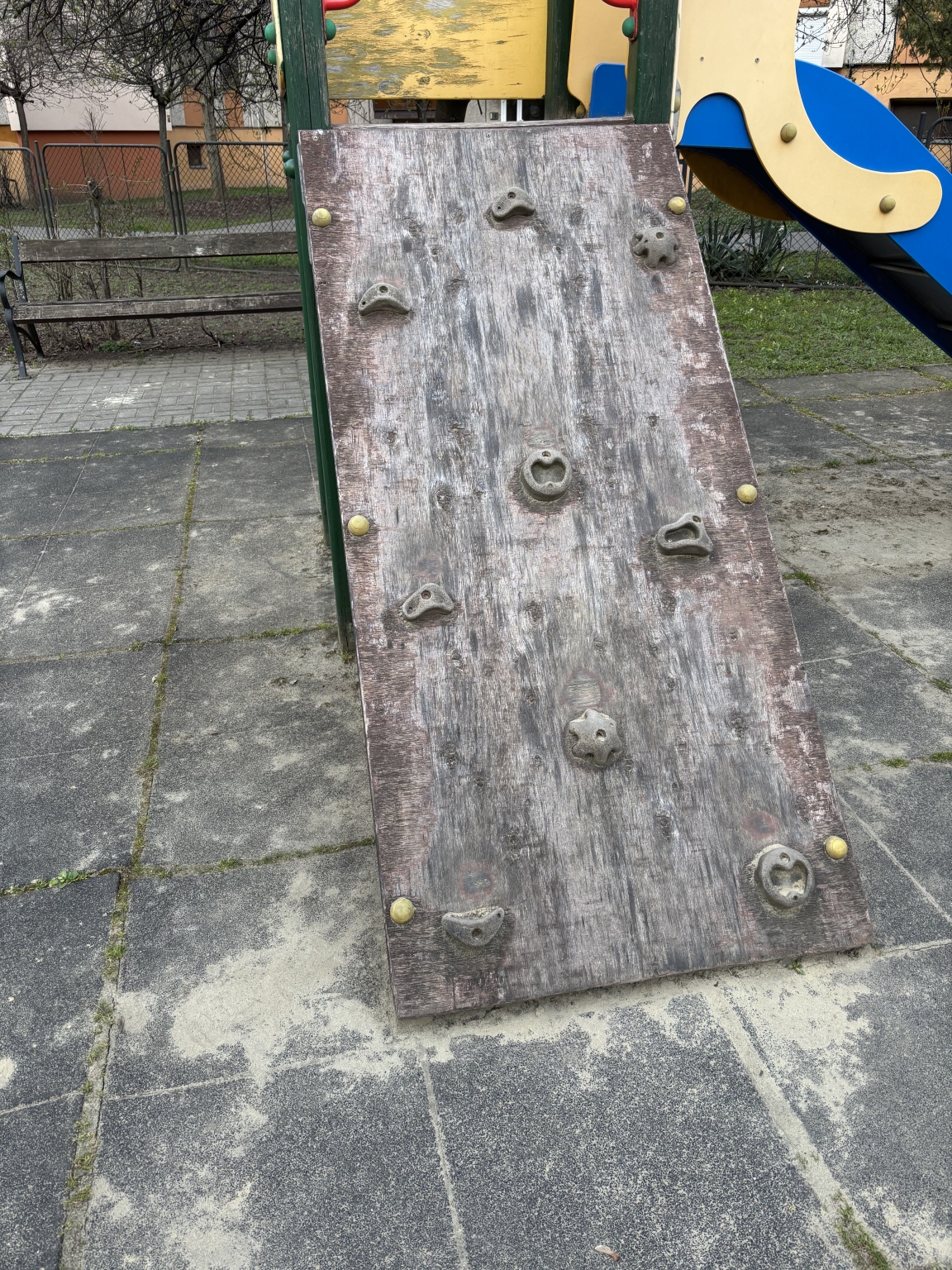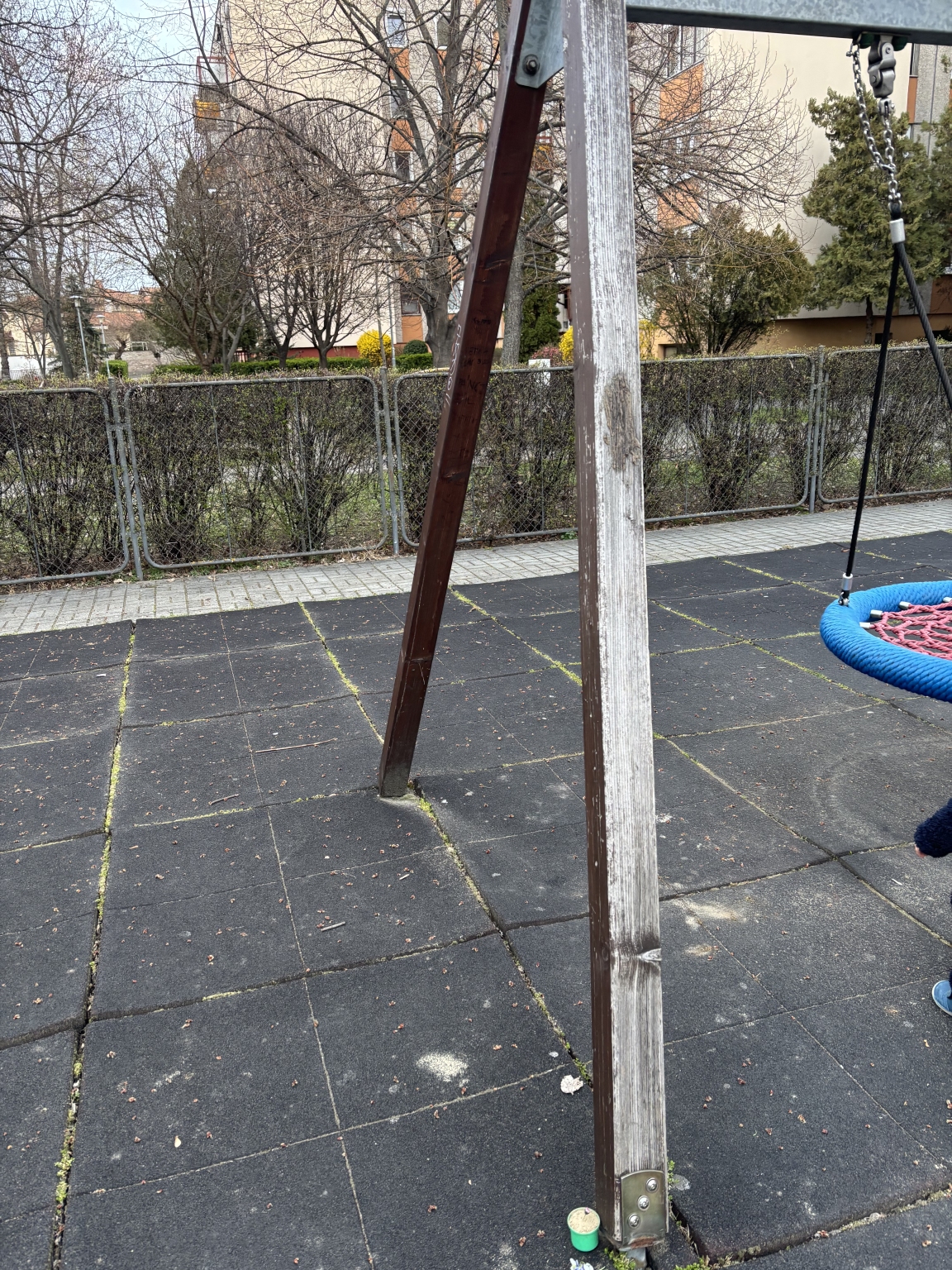A játszótér területén két mászókáról is lekopott a festék , gyerekek kezébe megy a szálka ,baleset veszélyes ,illetve ugyan ez van a két hinta állványon is .