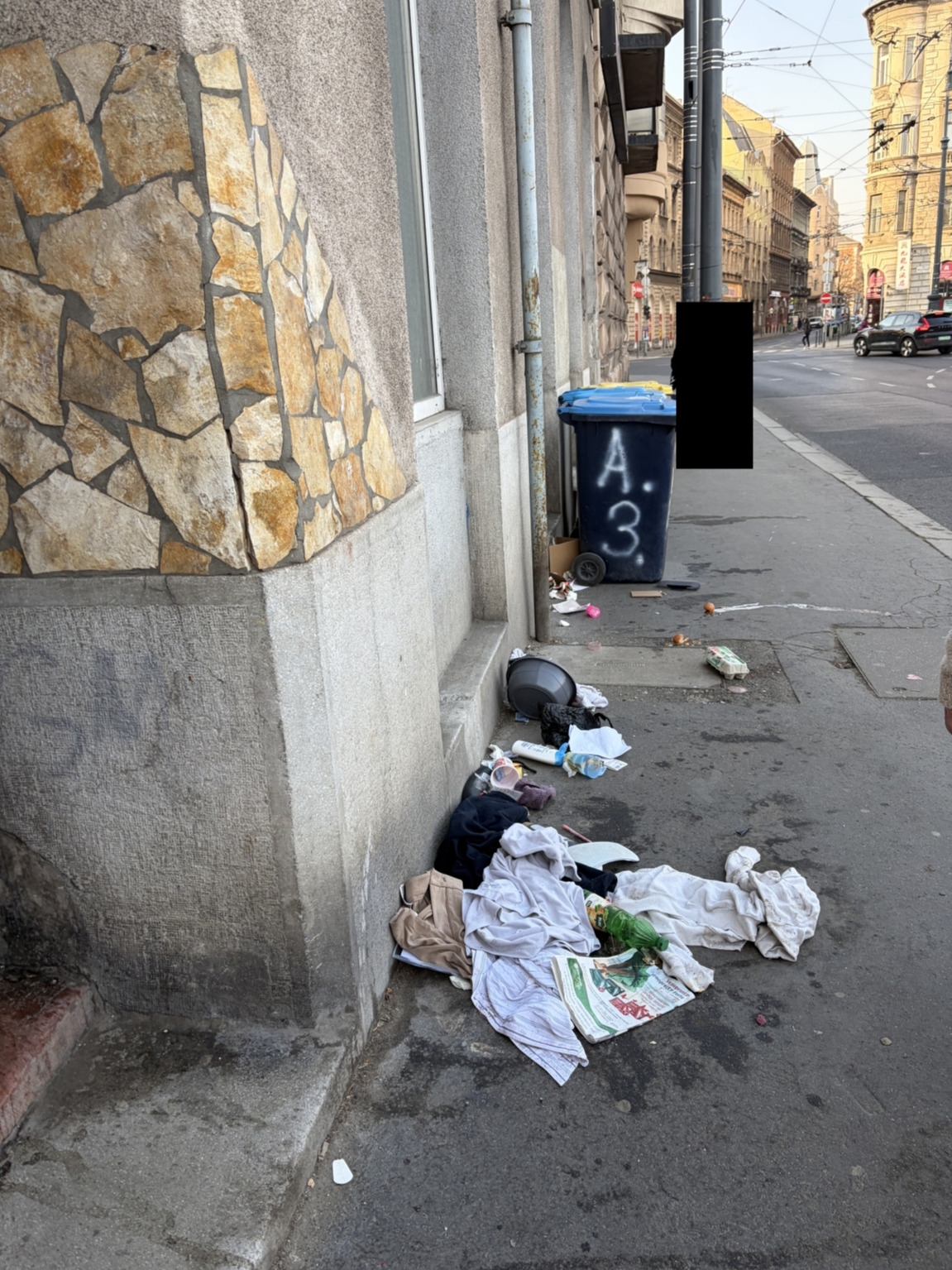 A buszmegállóban és környékén napok óta kiburult kukák, felhalmozott szemét, az FKF mellényes takarító is csak kikerüli.