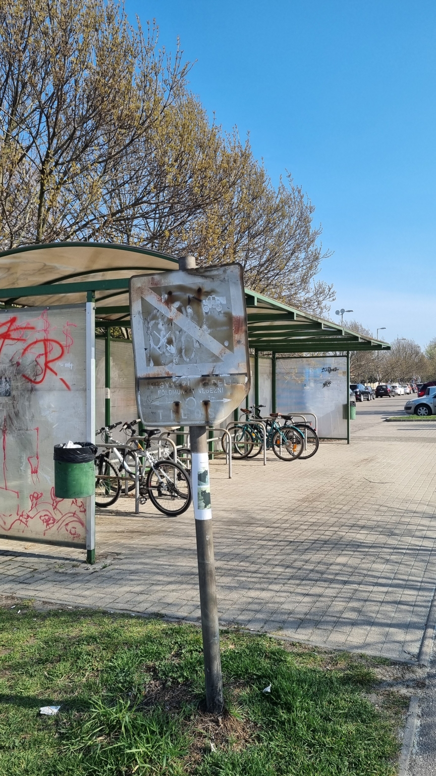 Rákoscsaba vasútállomás Naplás út felőli parkolójának szélén található egy földmunkákra vonatkozó és/vagy közlekedési (?) tábla, ami igazán rossz állapotban van, szinte kivehetetlen a jelzése.