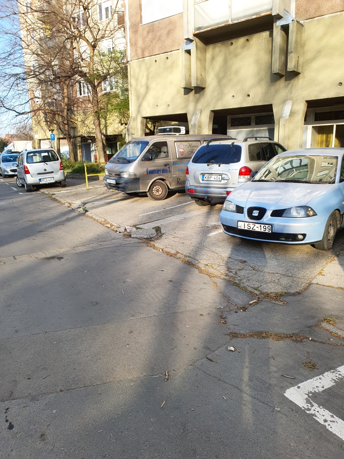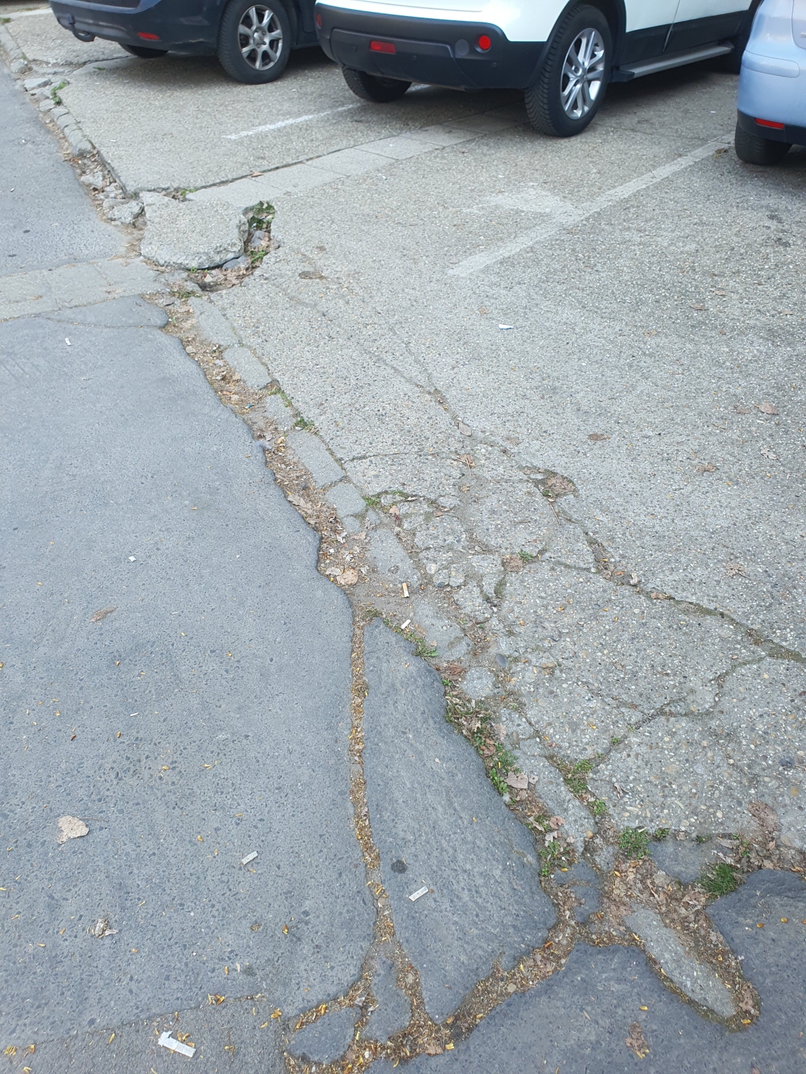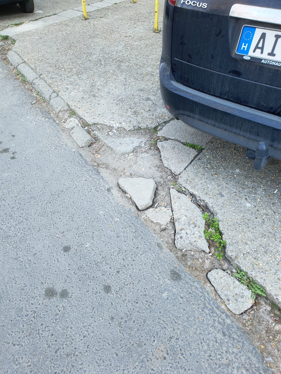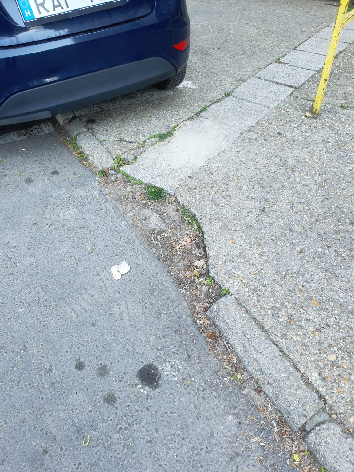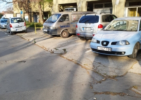 Hiányos szegélykő és törött burkolat ami nehezíti a társasház előtti parkolók használatát.