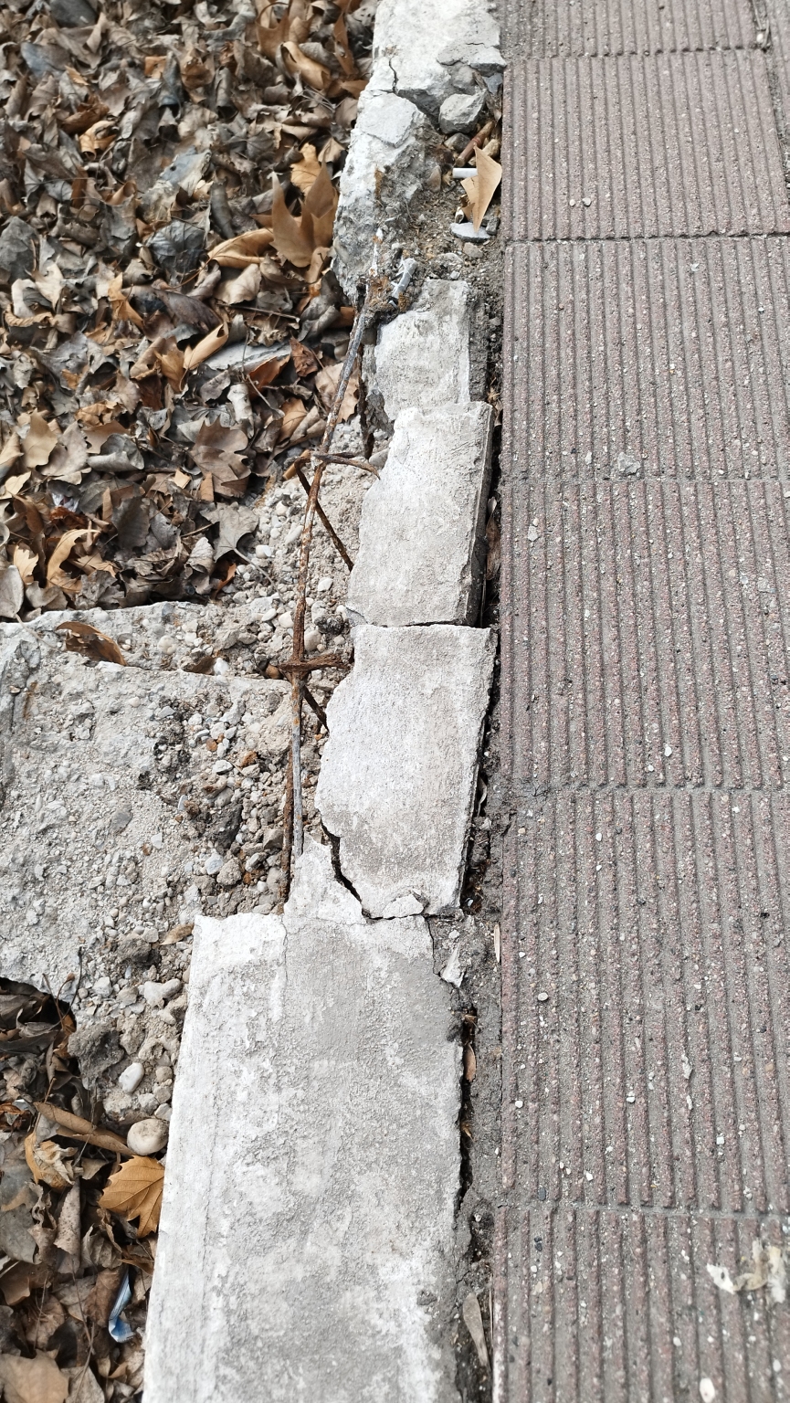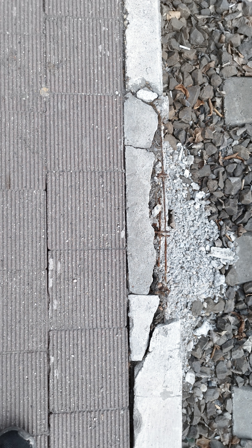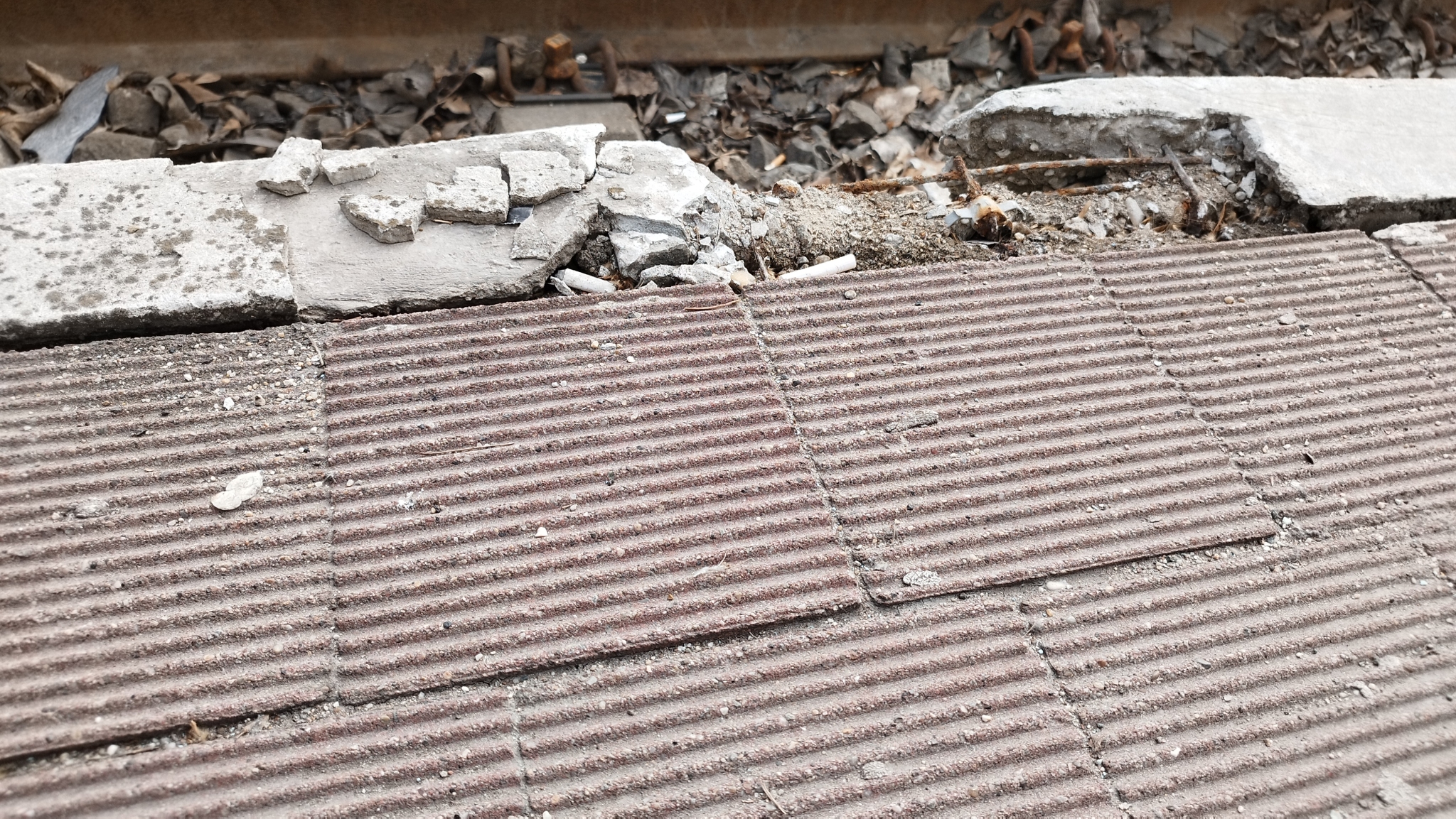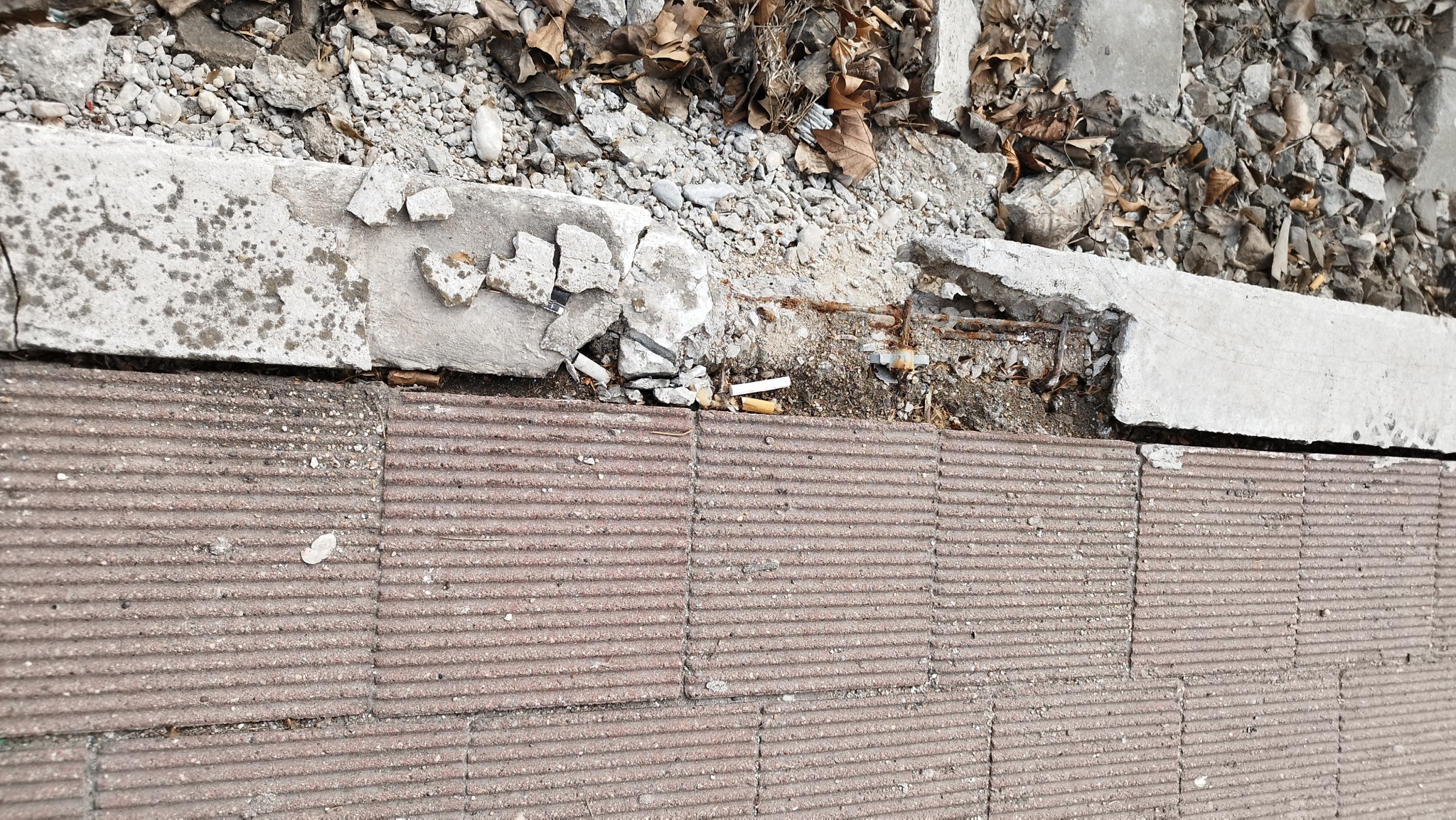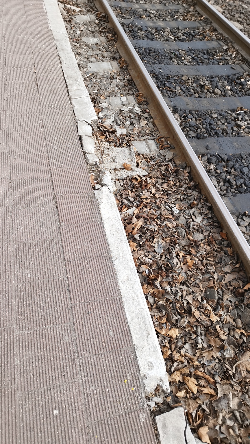 Szúrós vasalatmaradványok lógnak ki, a peron széle omlik, szétporladt.