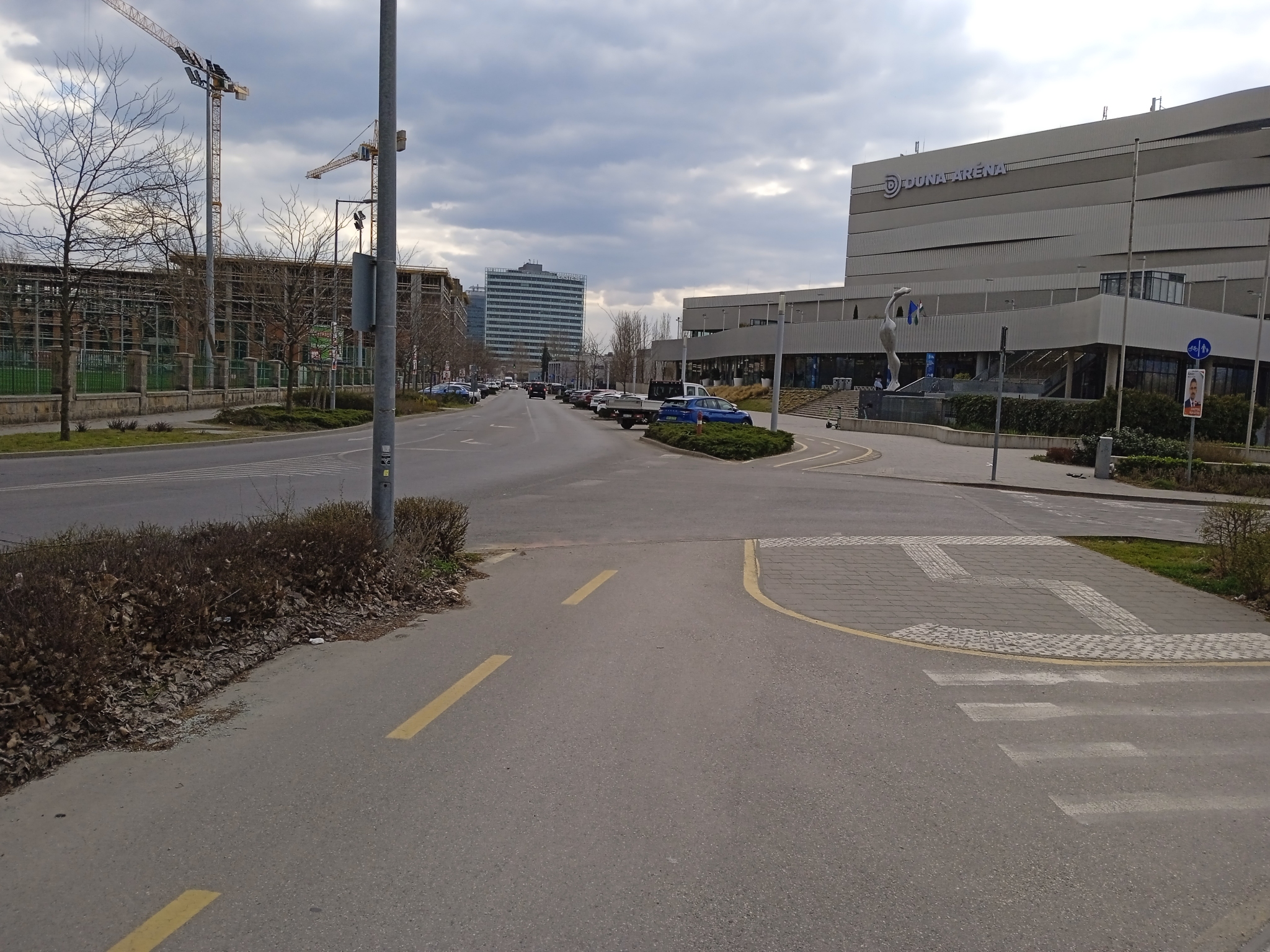 A Duna Aréna parkolójának ki‑ és bejáratánál a kerékpárút burkolati jelei gyakorlatilag teljesen lekoptak.