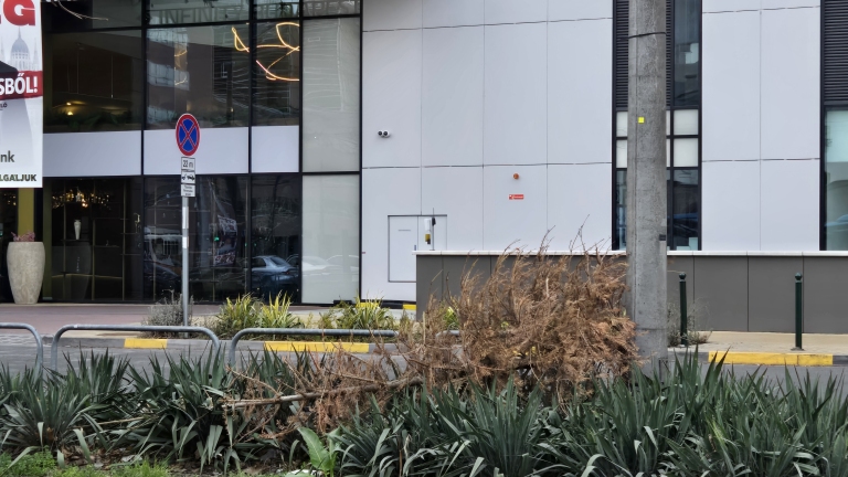 Elszáradt kidobott karácsonyfa hever egy bokron. A Soroksári út Haller utcai villamosmegállójánál.