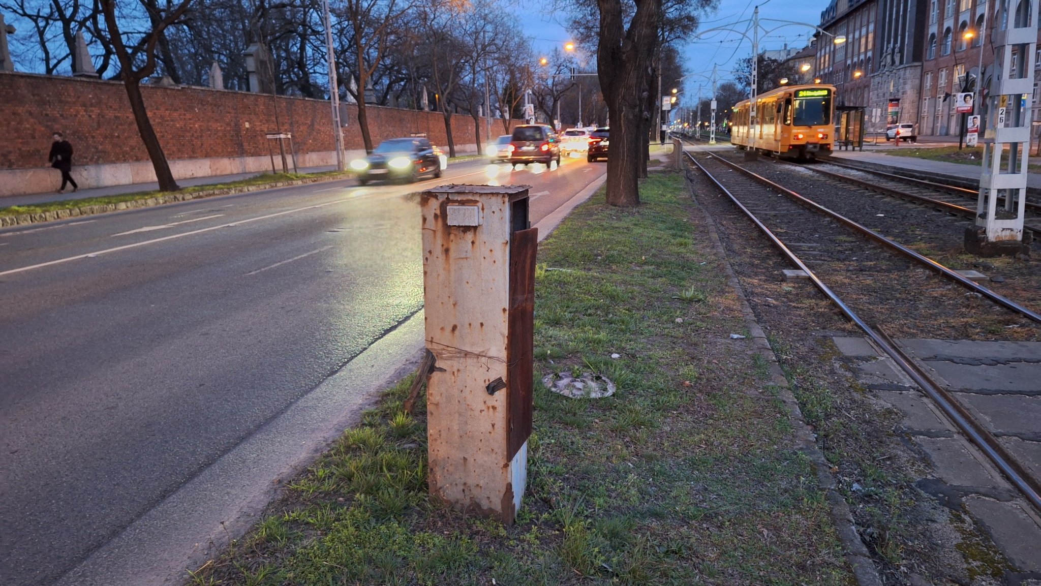 A 24-es villamos vonala mellett, a Dologház utca és a Keleti pályaudvar megállók között, de még az előbbihez közelebb van egy régi közműszekrény, amin csak úgy lóg a szétrozsdásodott ajtajó.