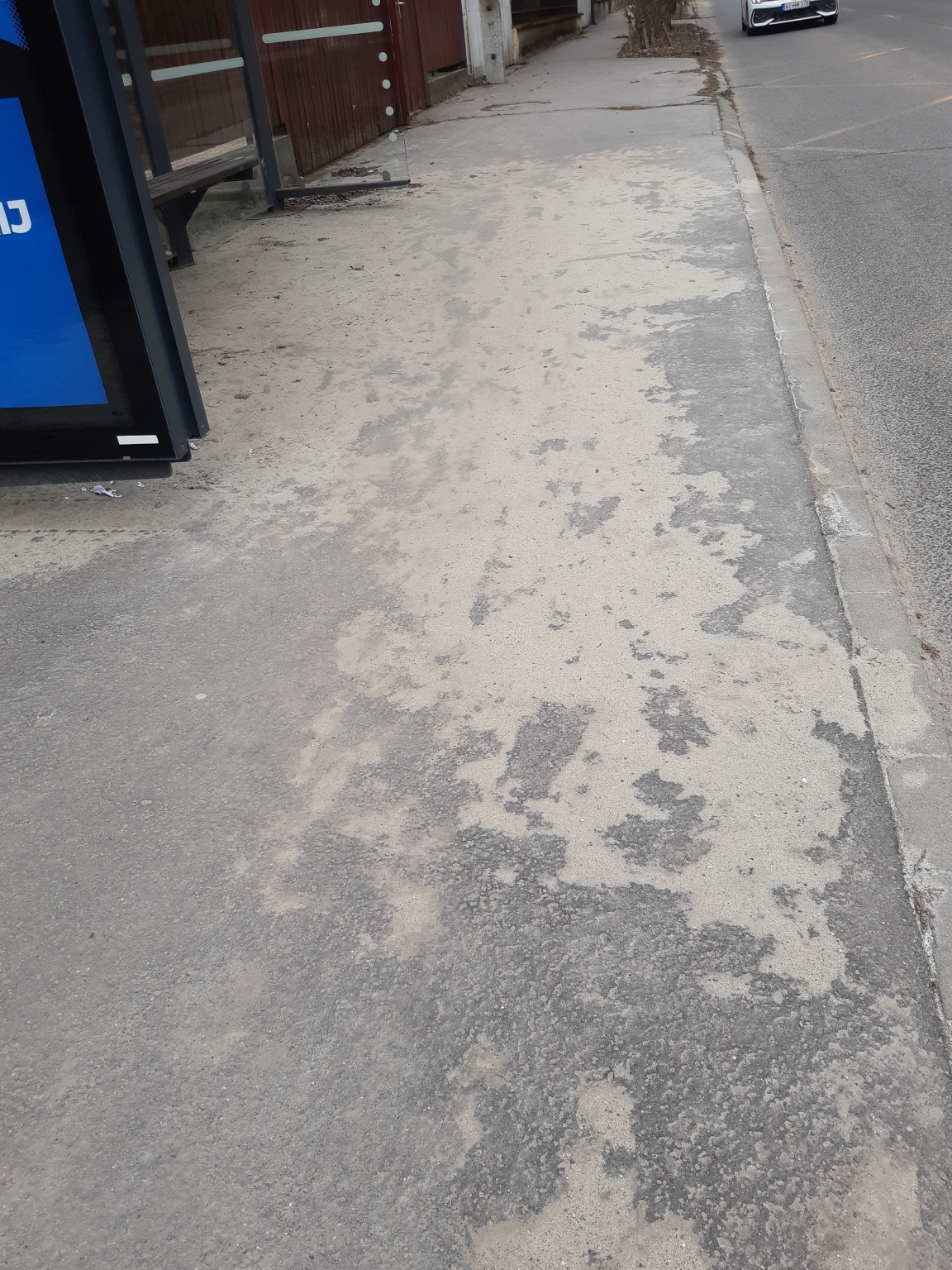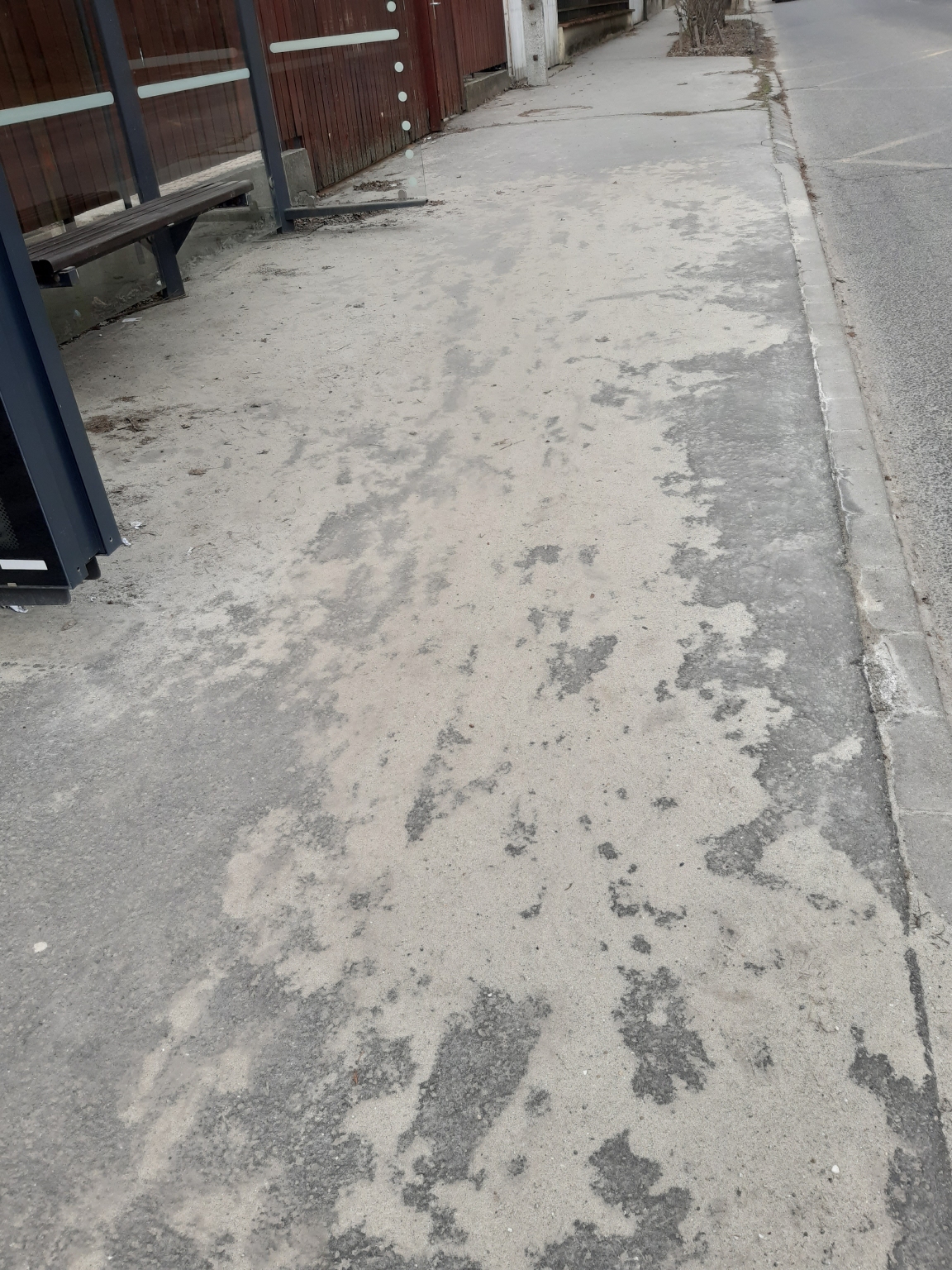 1029 Mariremetei uton a Bukkfa utcai buszmegalloban Huvosvolgy fele hetek ota eltakaritatlan homok boritja az egesz megallo teruletet.