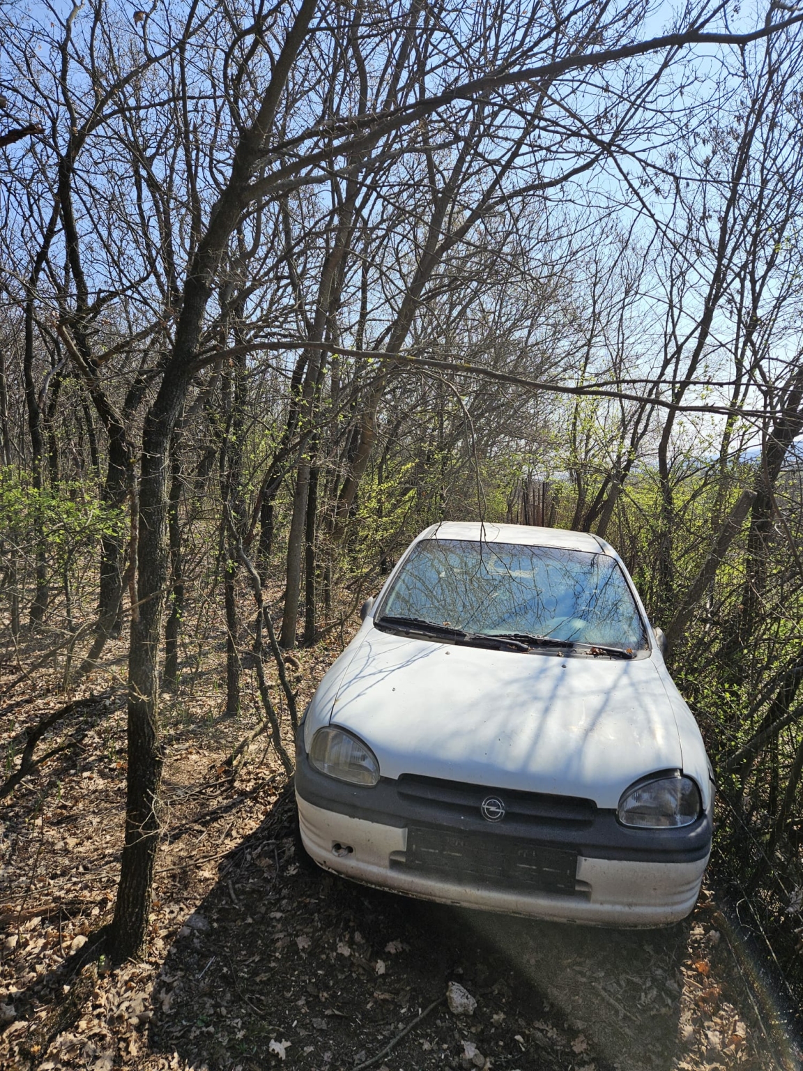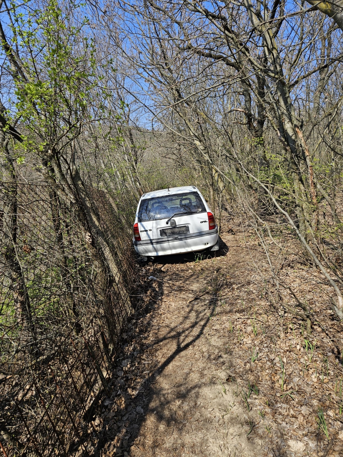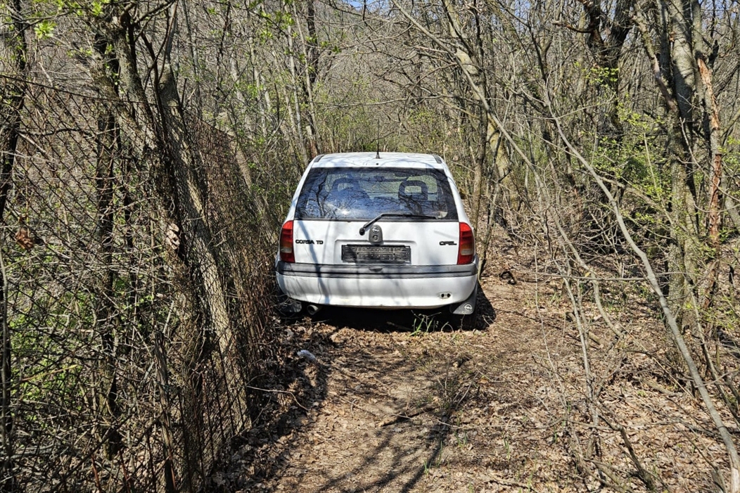 Elhagyott roncs autó áll a Rupphegy lábánál a tanösvény közepén.
