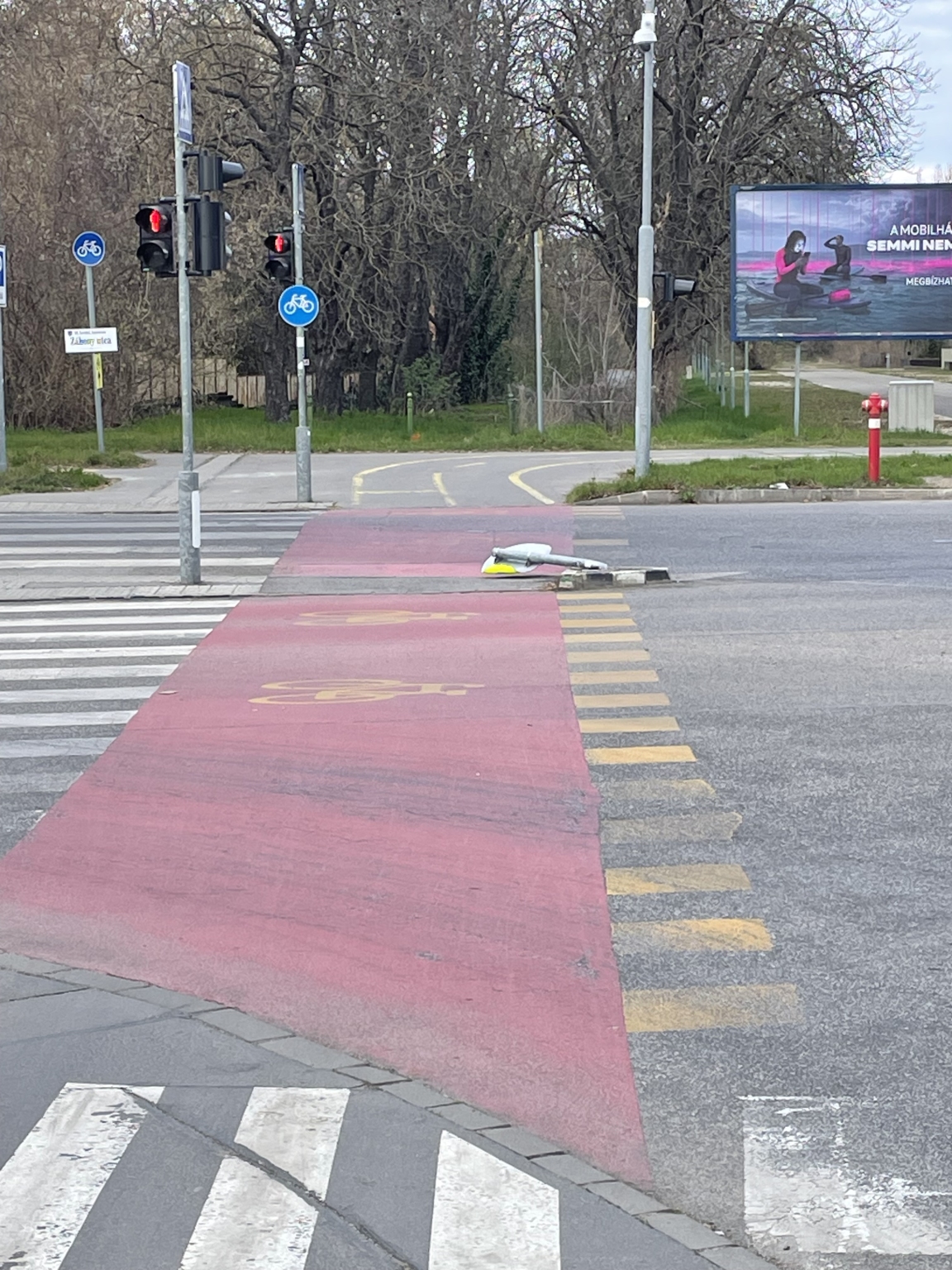 Valaki letarolta az egyik közlekedési táblát, és az így most rá van hajtva a kerékpárútra, meglepően balesetveszélyesen.