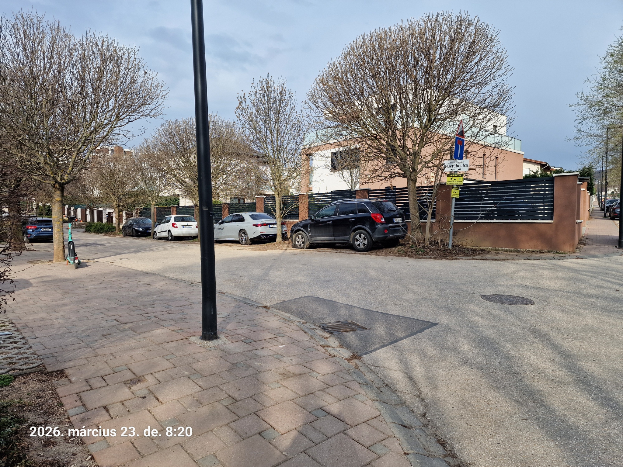 Budapest XI. ker. Keserűfű u 1. szám zöld sávjában tömegével parkolnak az autók.