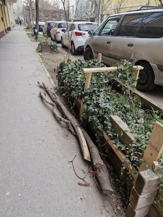 Angol utca 48 szám előtt, a járda mellett pár darab, egykor facsemete körül levő támasztó karó hever. Kérjük elvinni.