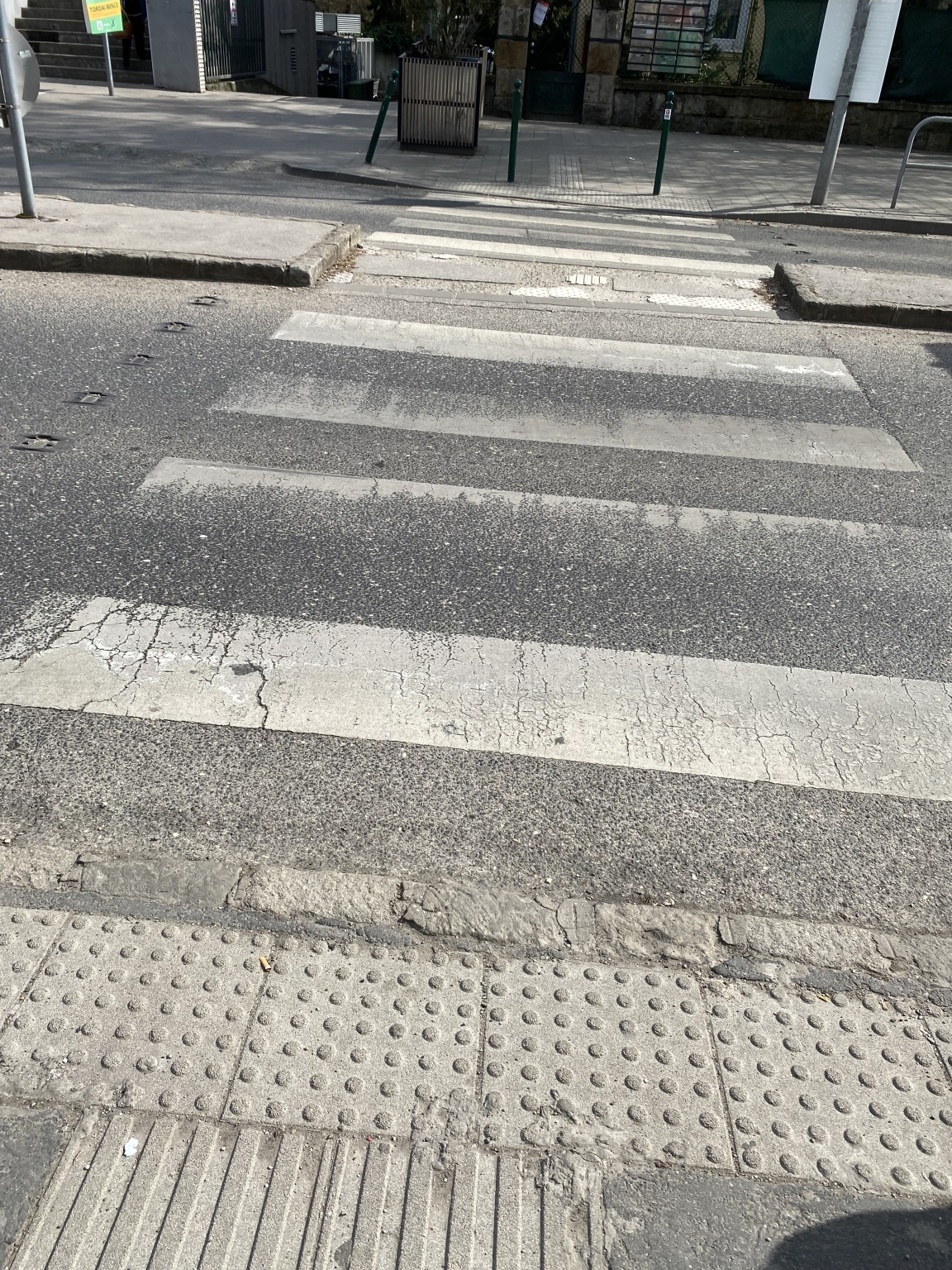 A Pasaréti körforgalomnál a gyalogátkelőnél a taktilis burkolati jelzések lekoptak, hiányosak.