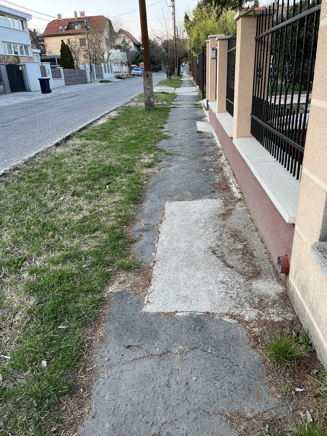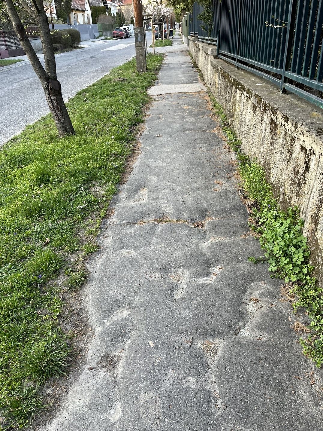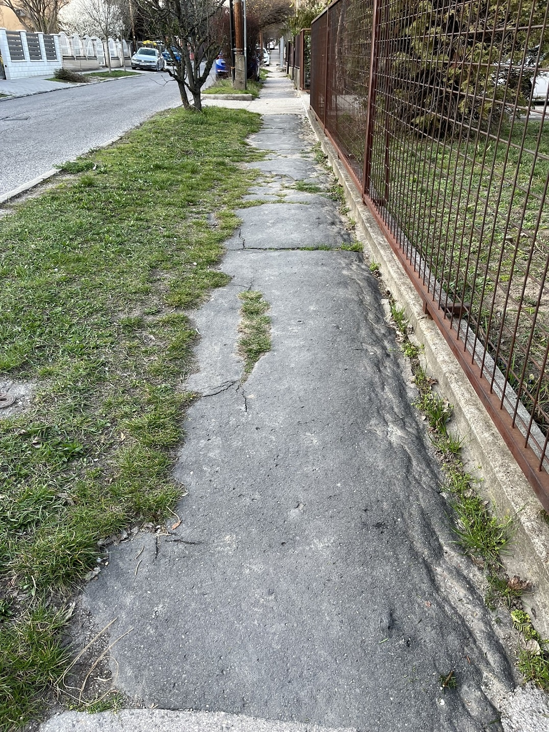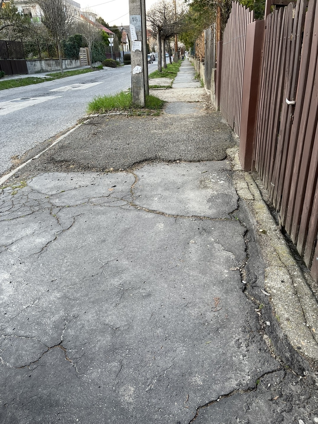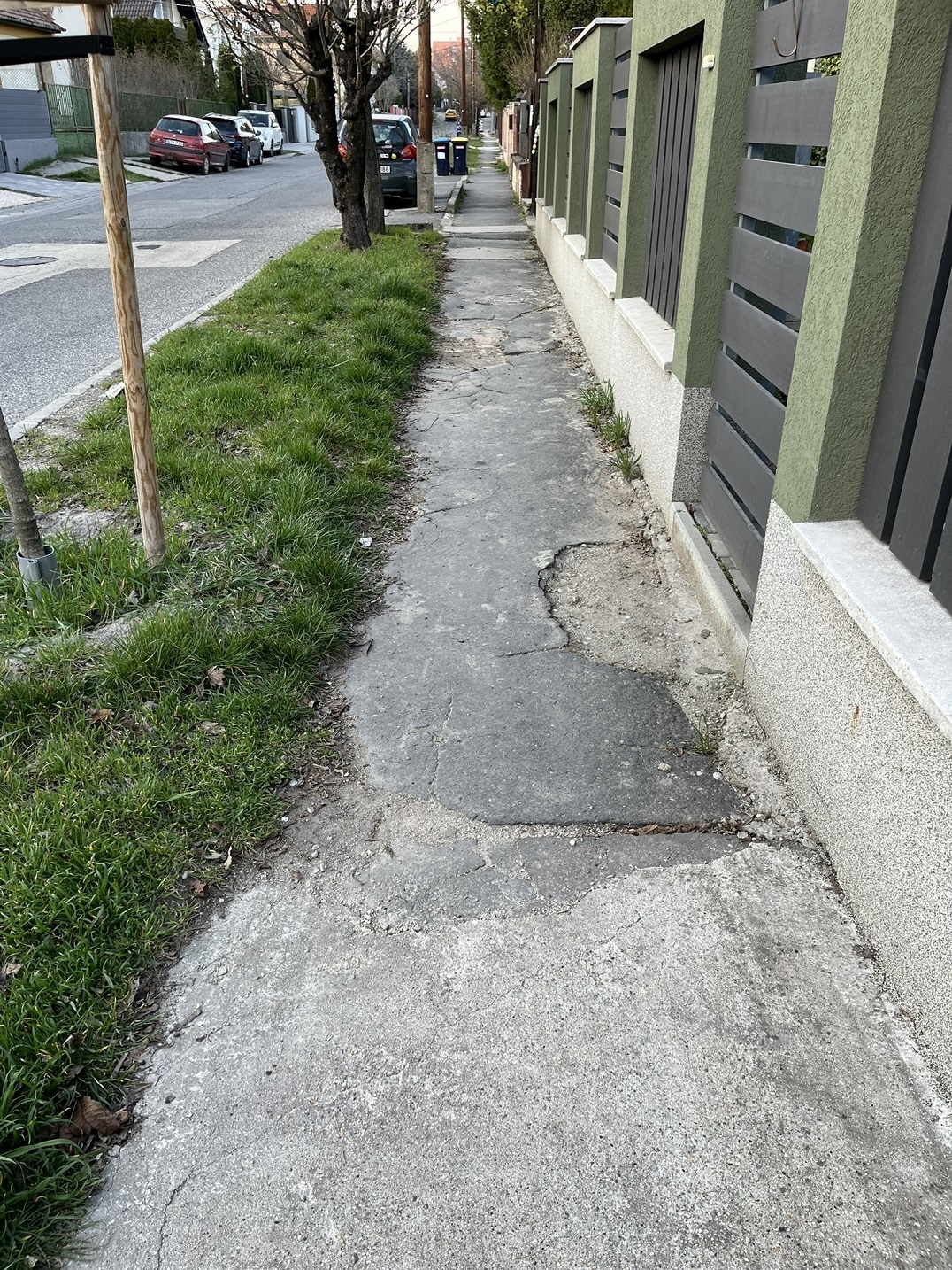 Szanaszét töredezett, felpúposodott, különböző anyagokból összefoltozott járdán kell közlekedniük a gyalogosoknak a 22. kerületi Kertész utcában (a 3-23 számok közötti szakaszon), mindezt úgy, hogy a világítás harmatgyenge, így kifejezetten veszélyes ez a szakasz. Kérjük a járda mielőbbi javítását!