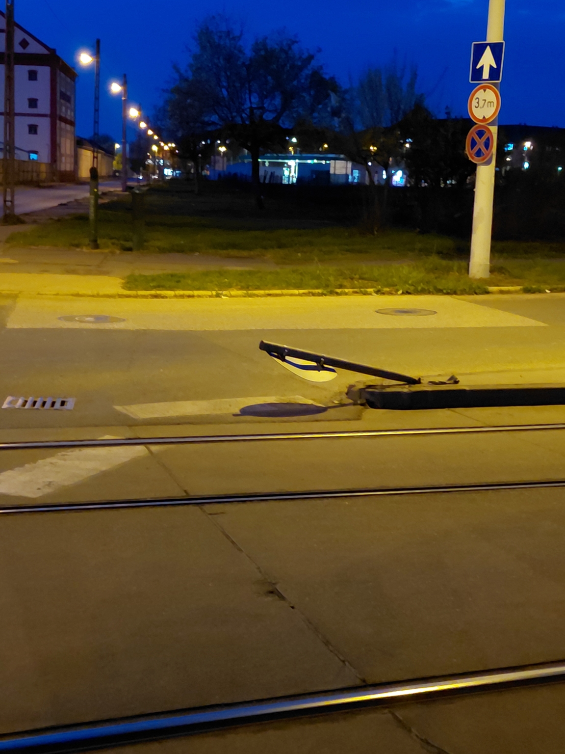 A Mázsa téren, a Mázsa utca és a Bihari utca sarkánál a villamospálya melletti járdaszogeten lévő terelőtábla (?) kidőlt, a földre hajlik.