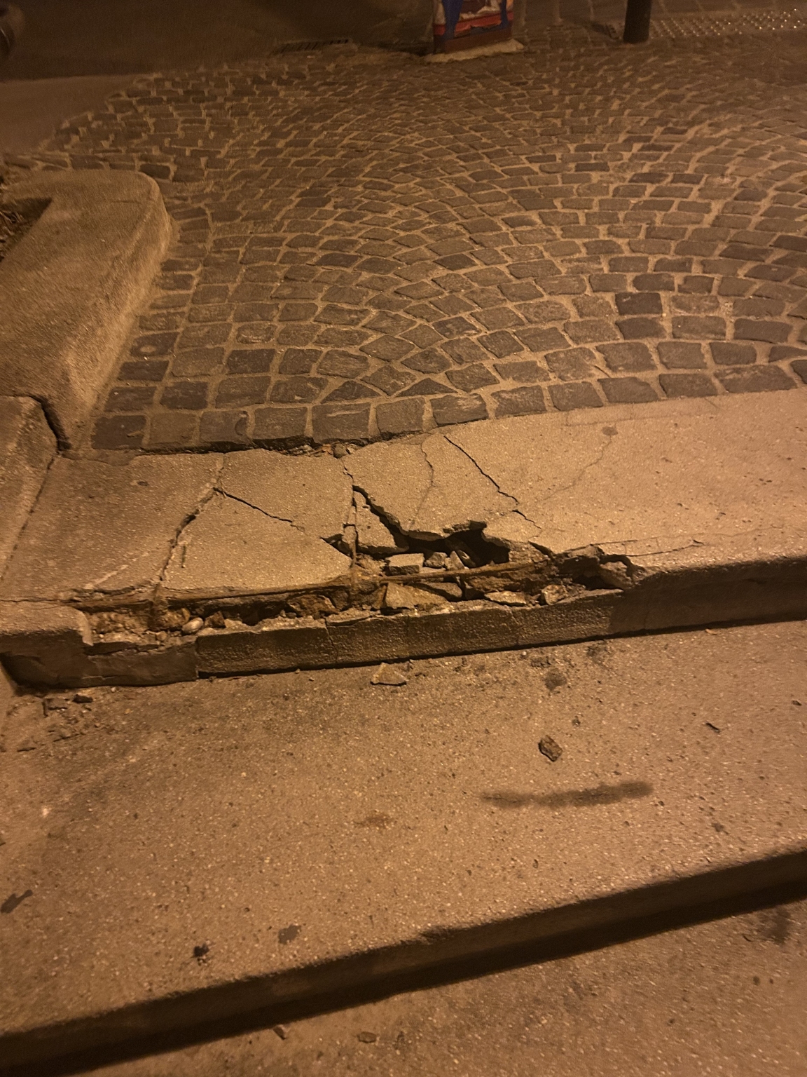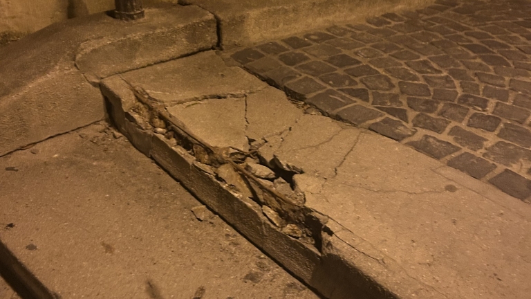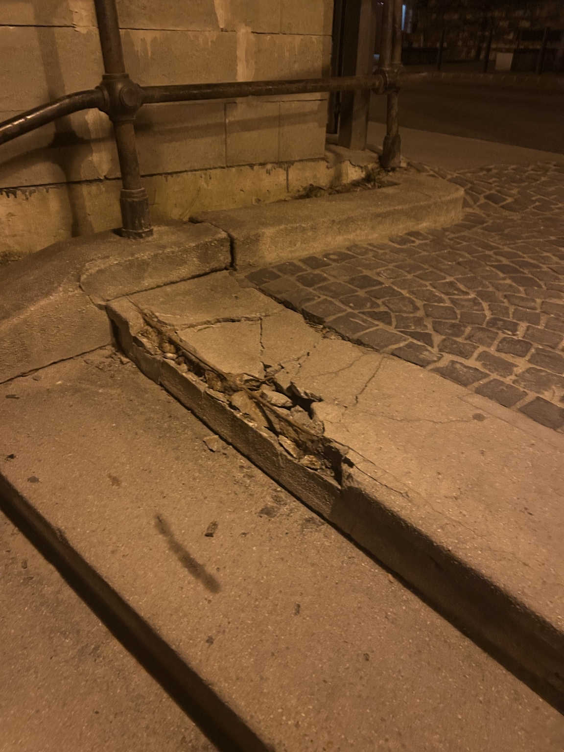 A Gránit lépcső felső lépcsőfoka beszakadt, a betonvas kilátszik, a beton berepedezett könnyen meg lehet benne botlani.