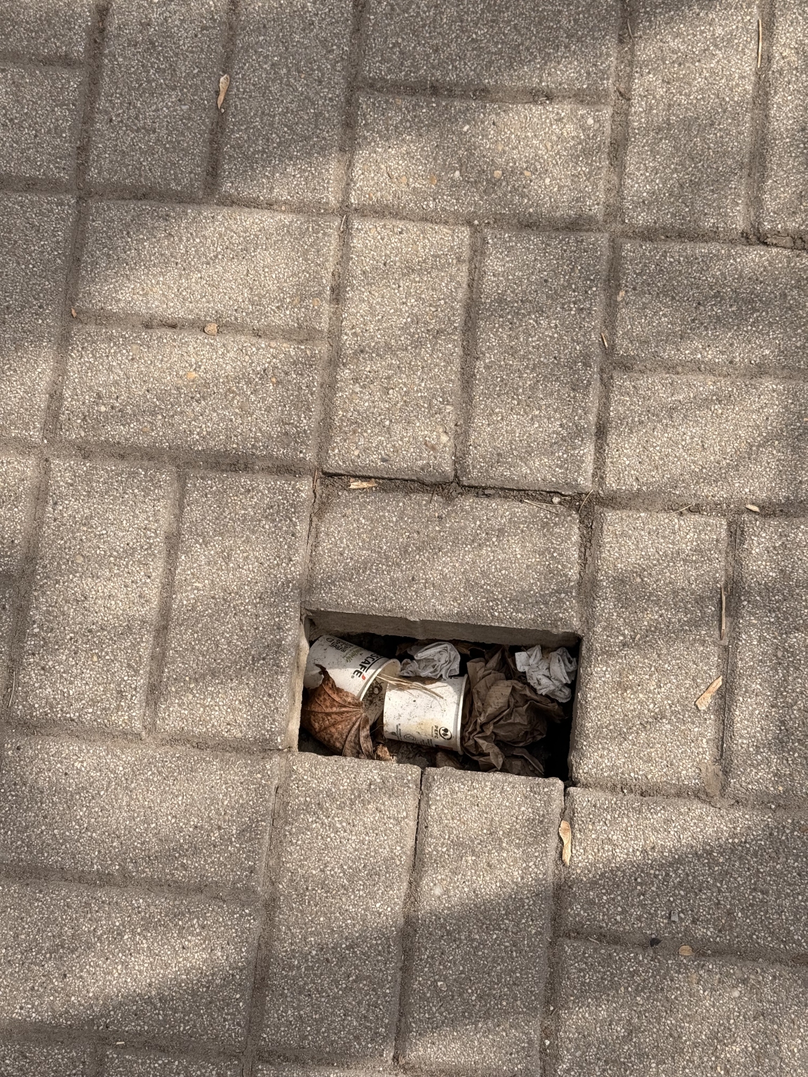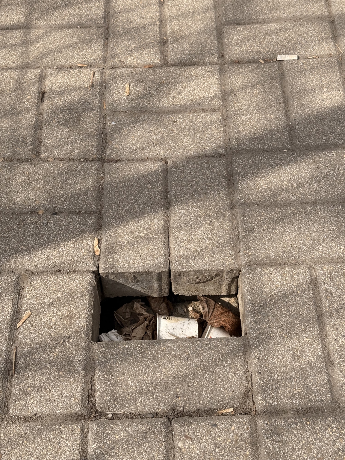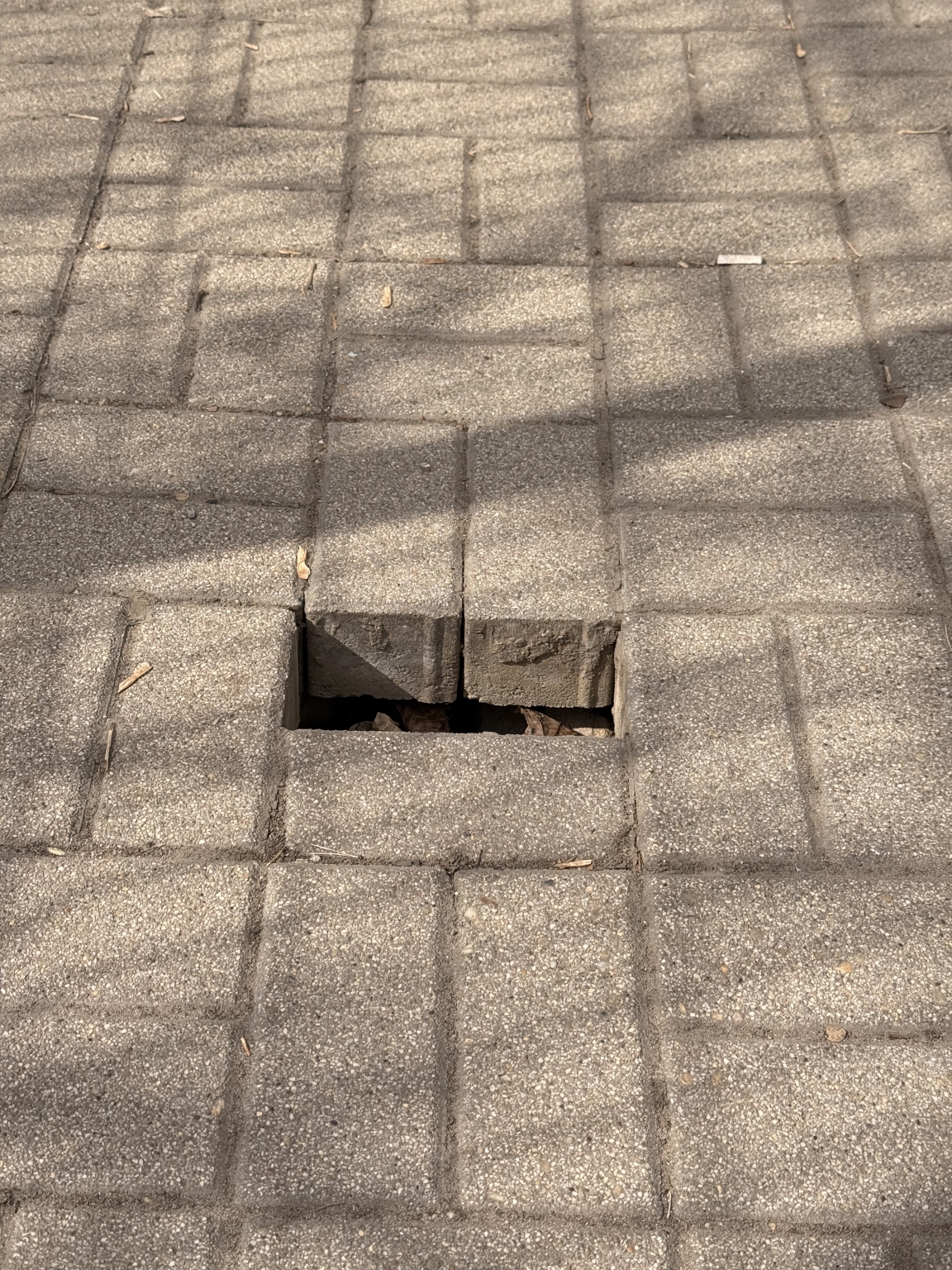 A térkő beszakadt, alatta nagyobb luk található.