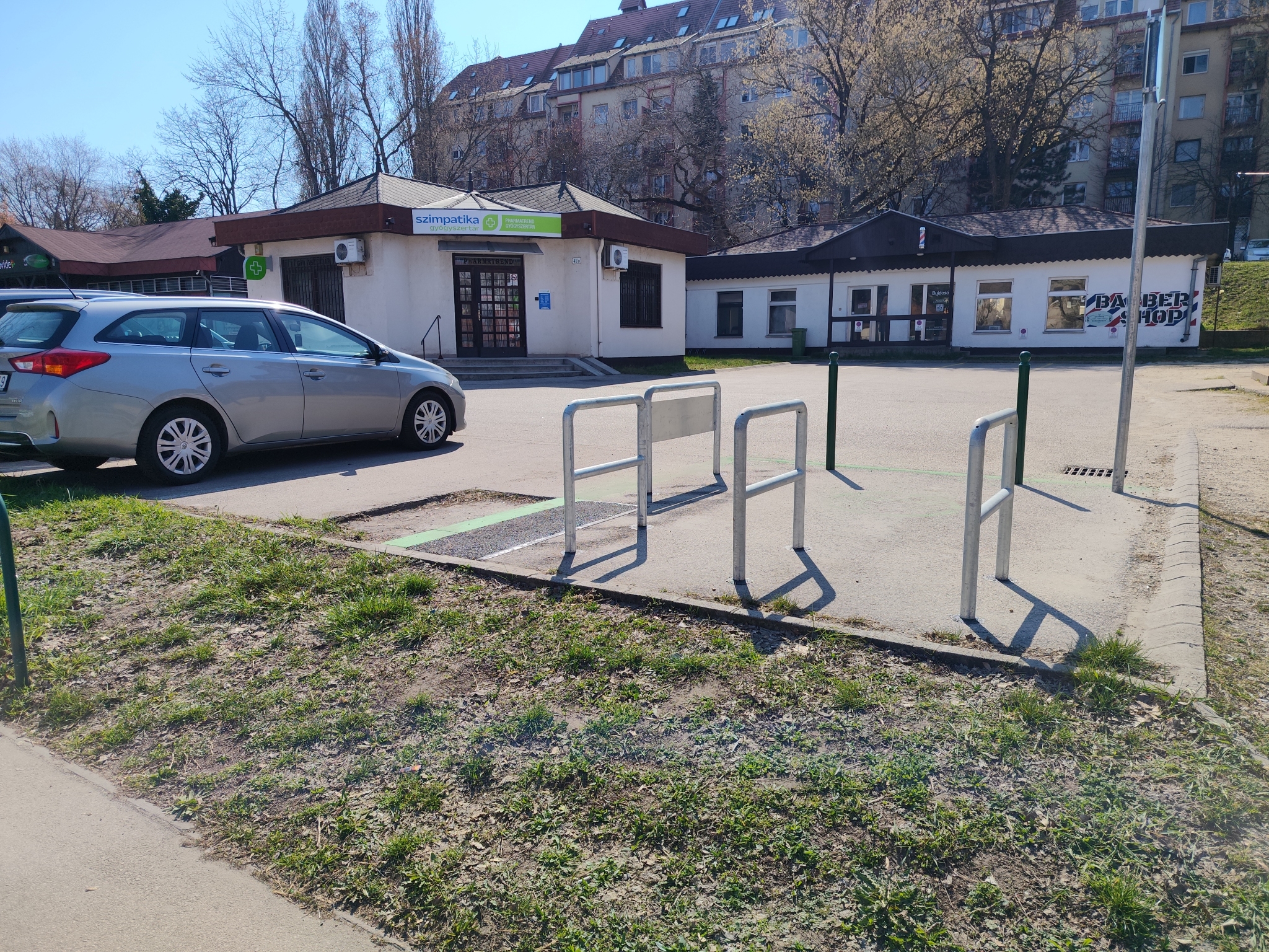 Most kerékpár támaszokat telepítettek ide, de csak félig aszfaltozták le a lyukat.
