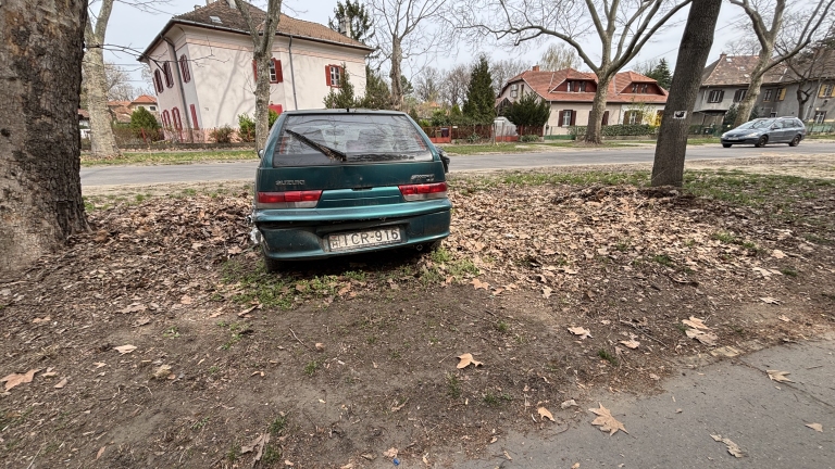 A képen látható Suzuki évek óta a képen látható állapotban a XIX. kerület Esze Tamás utca 15. szám előtt parkol. Az autó műszaki vizsgája 2022-ben lejárt.