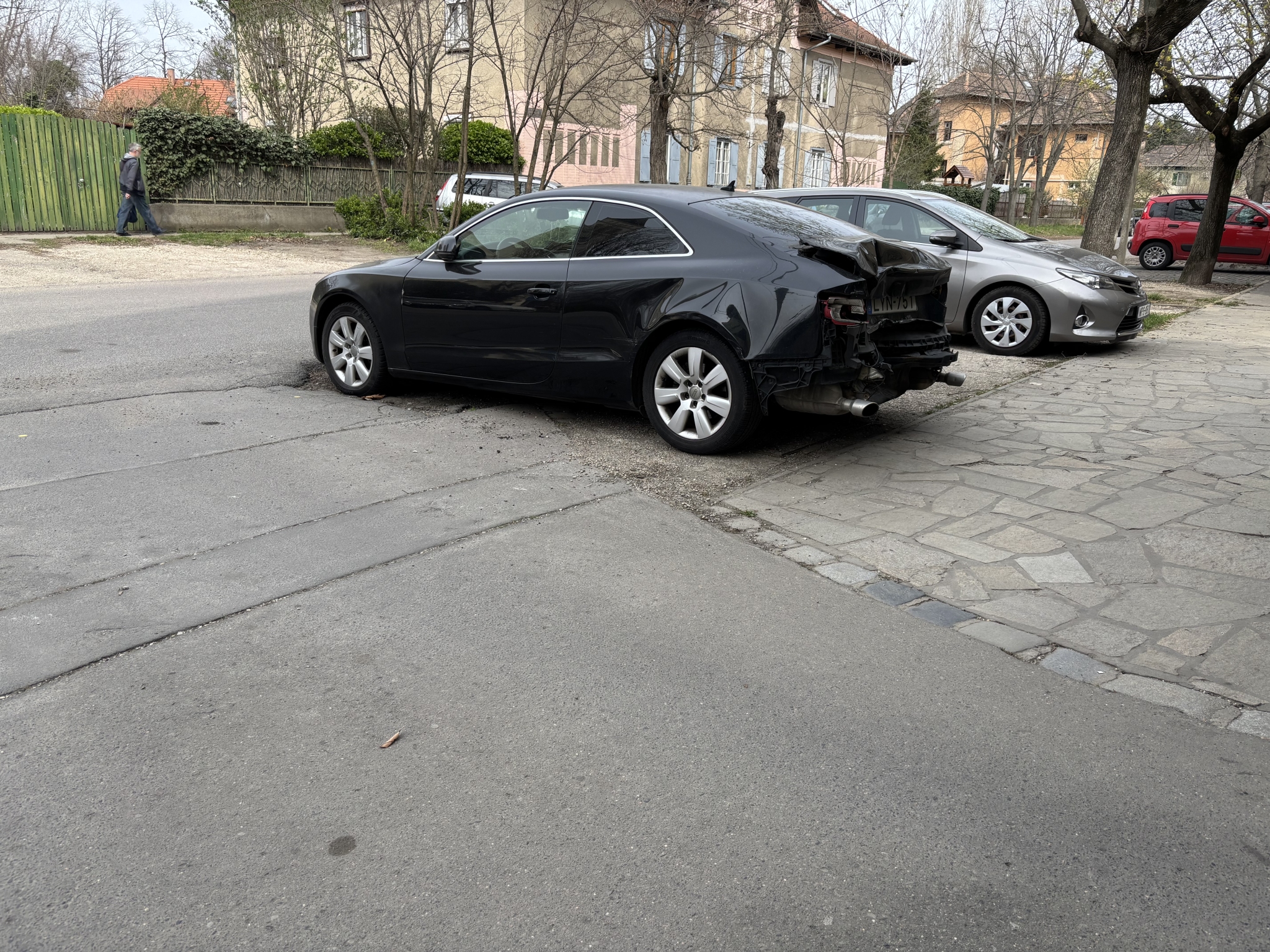 A képen látható Audi össze van törve, ki van vonva a forgalomból, lejárt a műszakija és hetek óta a XIX. kerület Kós Károly tér 1. szám és a Thököly utca sarkán parkol.