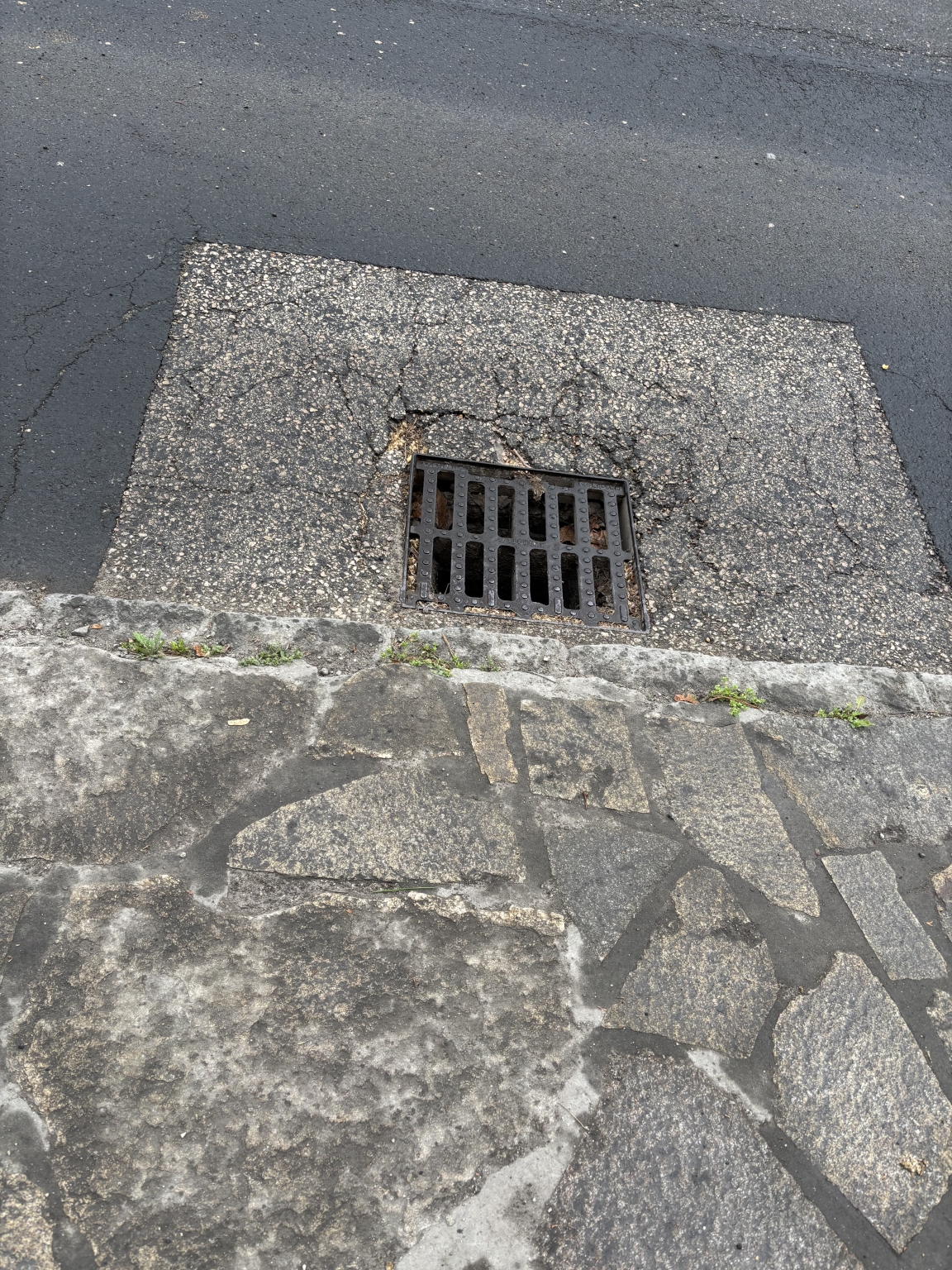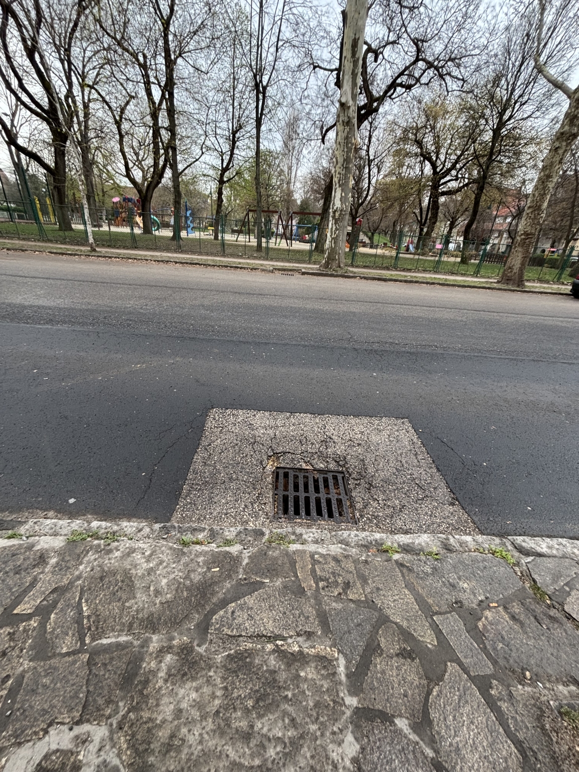 A Kos Károly tér 15. szám előtt levő csapadékvíz elvezető a képen látható állapotban van. Be van süllyedve és töredezik körülötte az aszfalt.