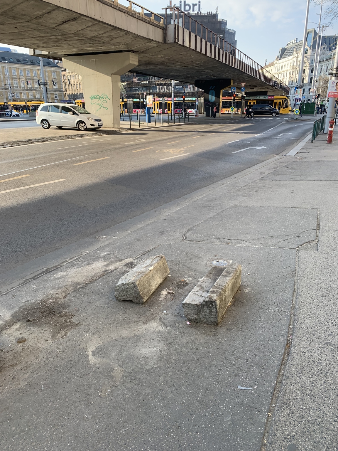 A Nyugati tér 4 előtt óriási kődarabok a járdán,