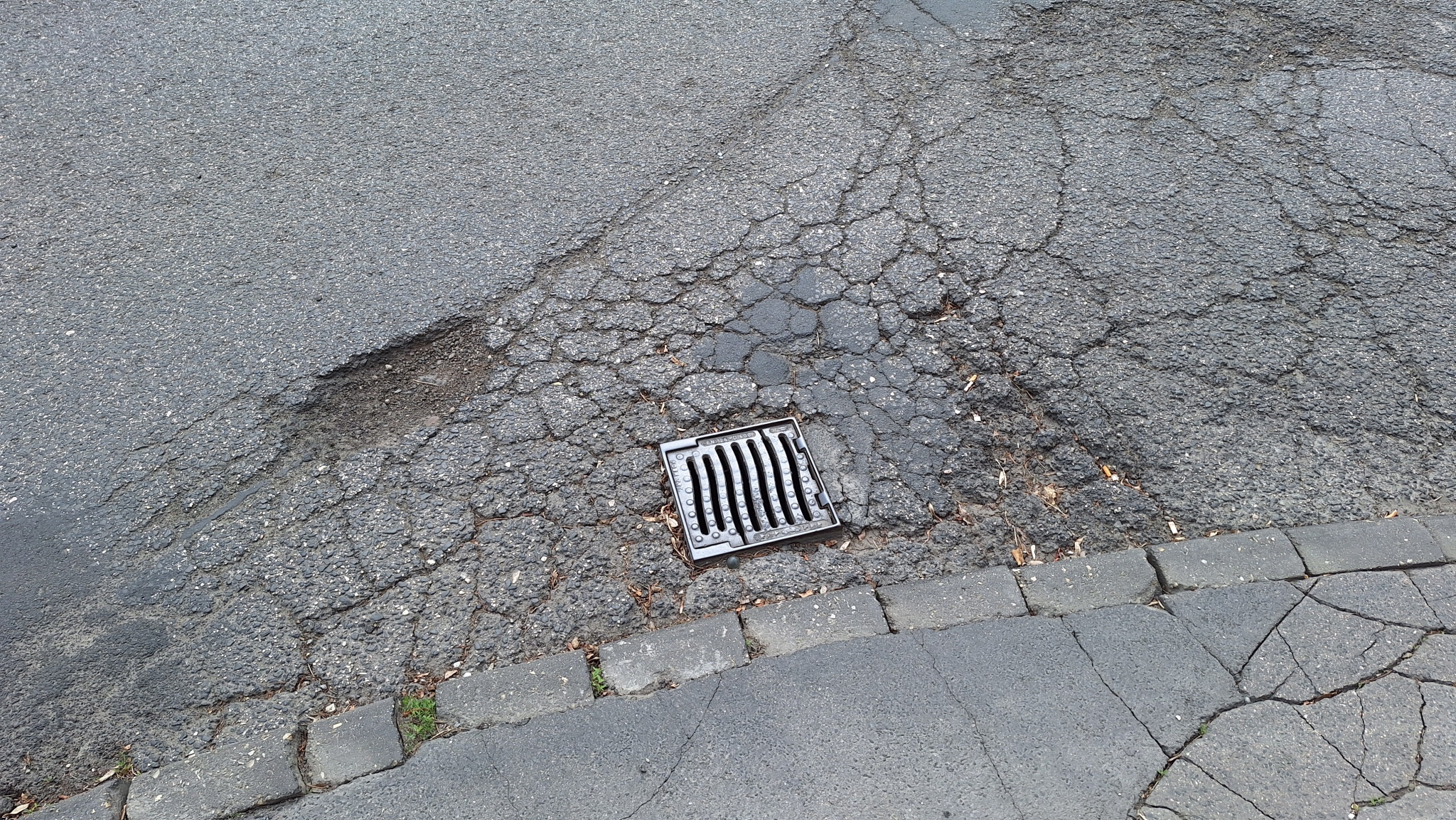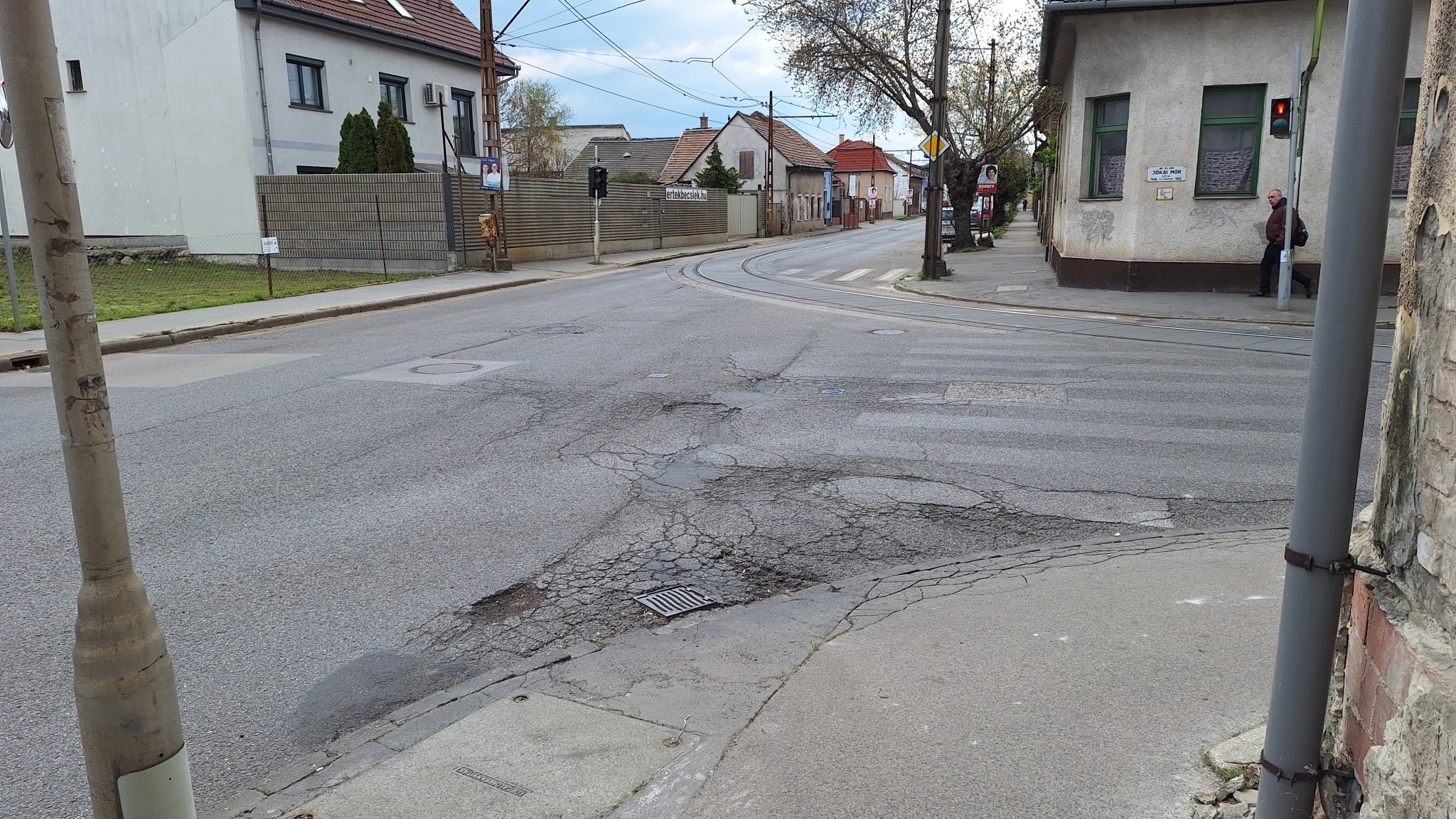 A Jókai Mór és Nagysándor József utca sarkán lévő csatornanyílás rácsa be van esve, ráadásul ki is áll az úttest síkjából.