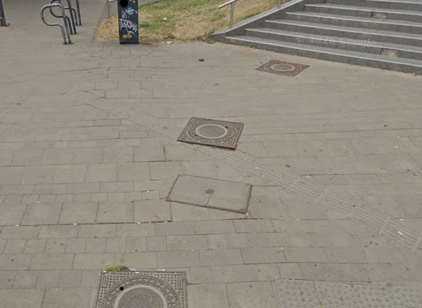 A bolt közvetlen kijáratánál a járdán lévő fedlap kiáll a burkolat síkjából.