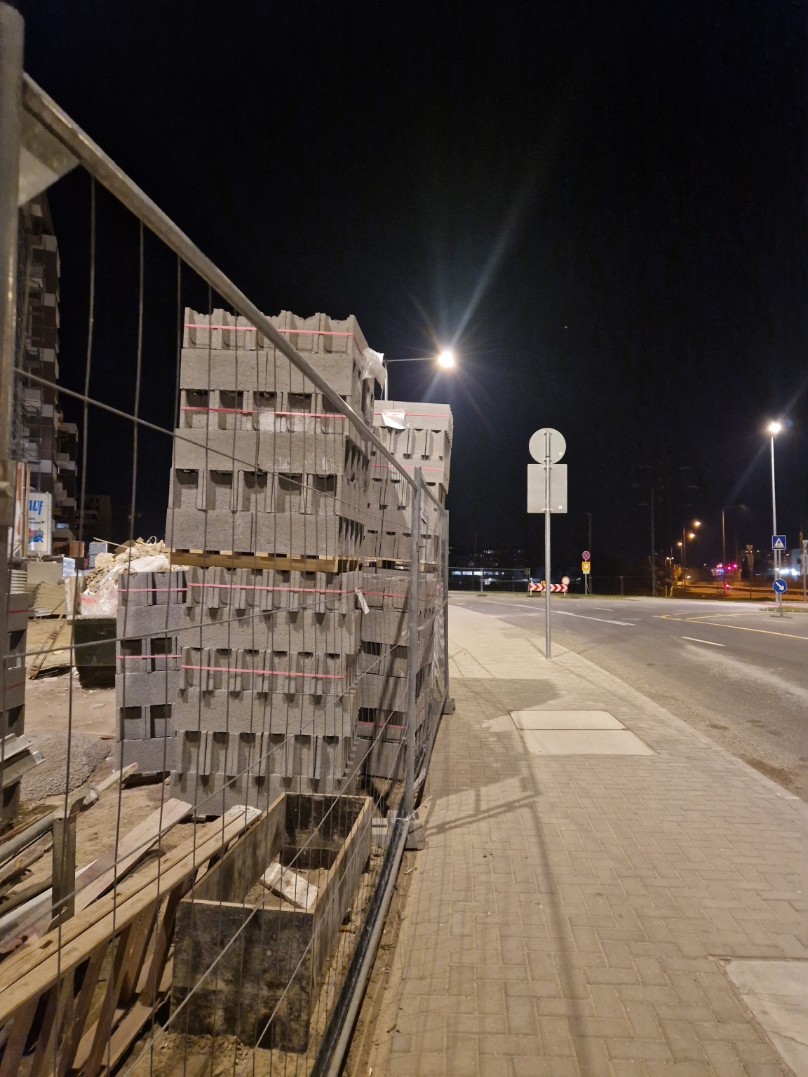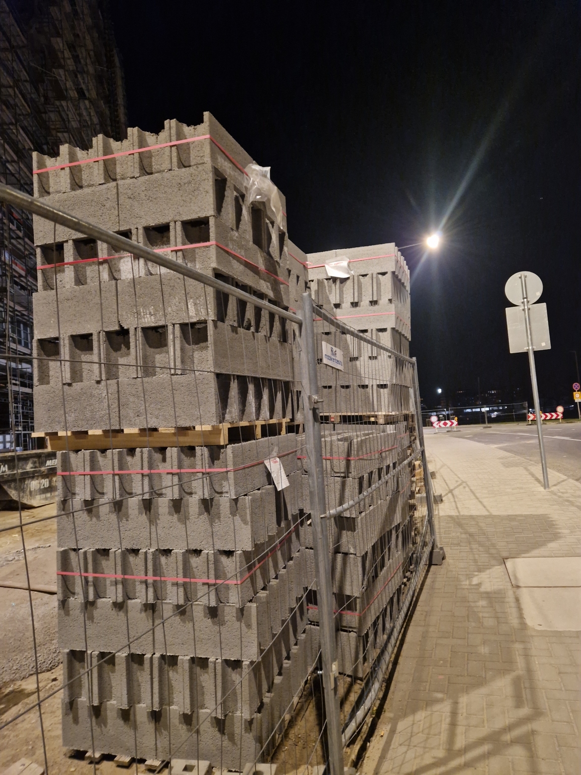 Az építkezési terület szélén a járda mellett a zsalukő halom kifele dől.