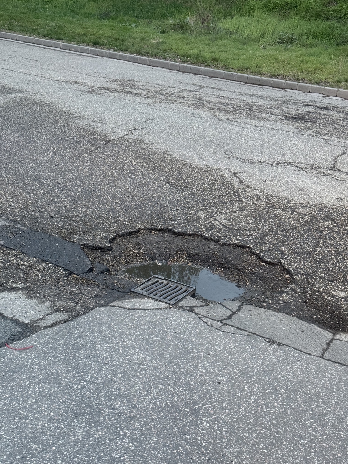 Nagyon mély, balesetveszélyes kátyú az esőelvezető csatorna mellett.