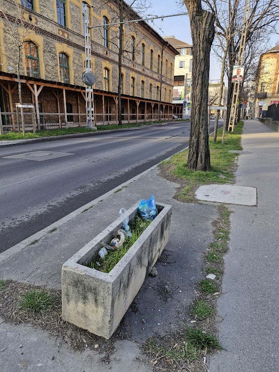A Szugló utcában több gazdátlan, mocskos, gondozatlan beton virágláda is van az Angol utca és a Nagy Lajos király útja közötti szakaszon.