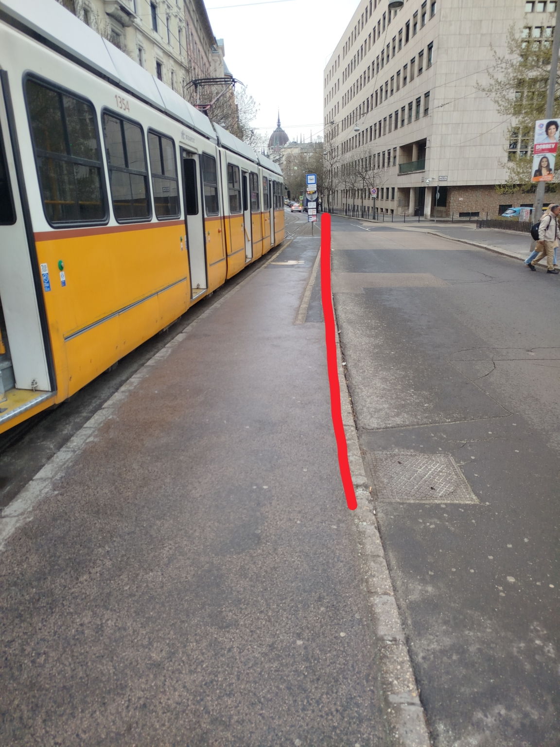 A Jászai Mari téri 2-es villamos megállójának úttest felé eső peronja nagyon szűk. Amikor egy-egy tömött villamos megérkezik, az utasok gyakran kilépnek az úttestre is, ahonnan nagy sebeaséggel jönnek az autók a hídról le. Volt olyanra is példa, hogy az utasok nem fértek már el, és egymást lökték le/ki az autók elé. Nagyon jó lenne a peronnal párhuzamos korlátsor, ami meggátolná a baleseteket. Köszönjük a segítséget.