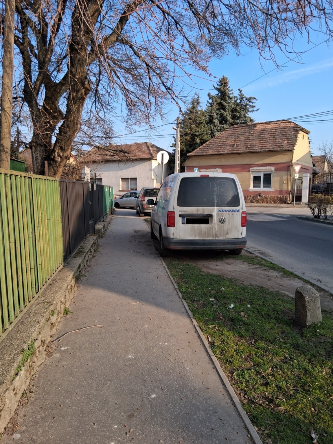 Soroksáron a Tisza utca, Rézöntő utca sarkán így parkolnak az óvodába érkező szülők. Szerintem ez szabálytalan és veszélyes. Ráadásul ha esik, pocsolya van, akkor felhordják a sarat a járdára, amit ugye senki nem takarít.