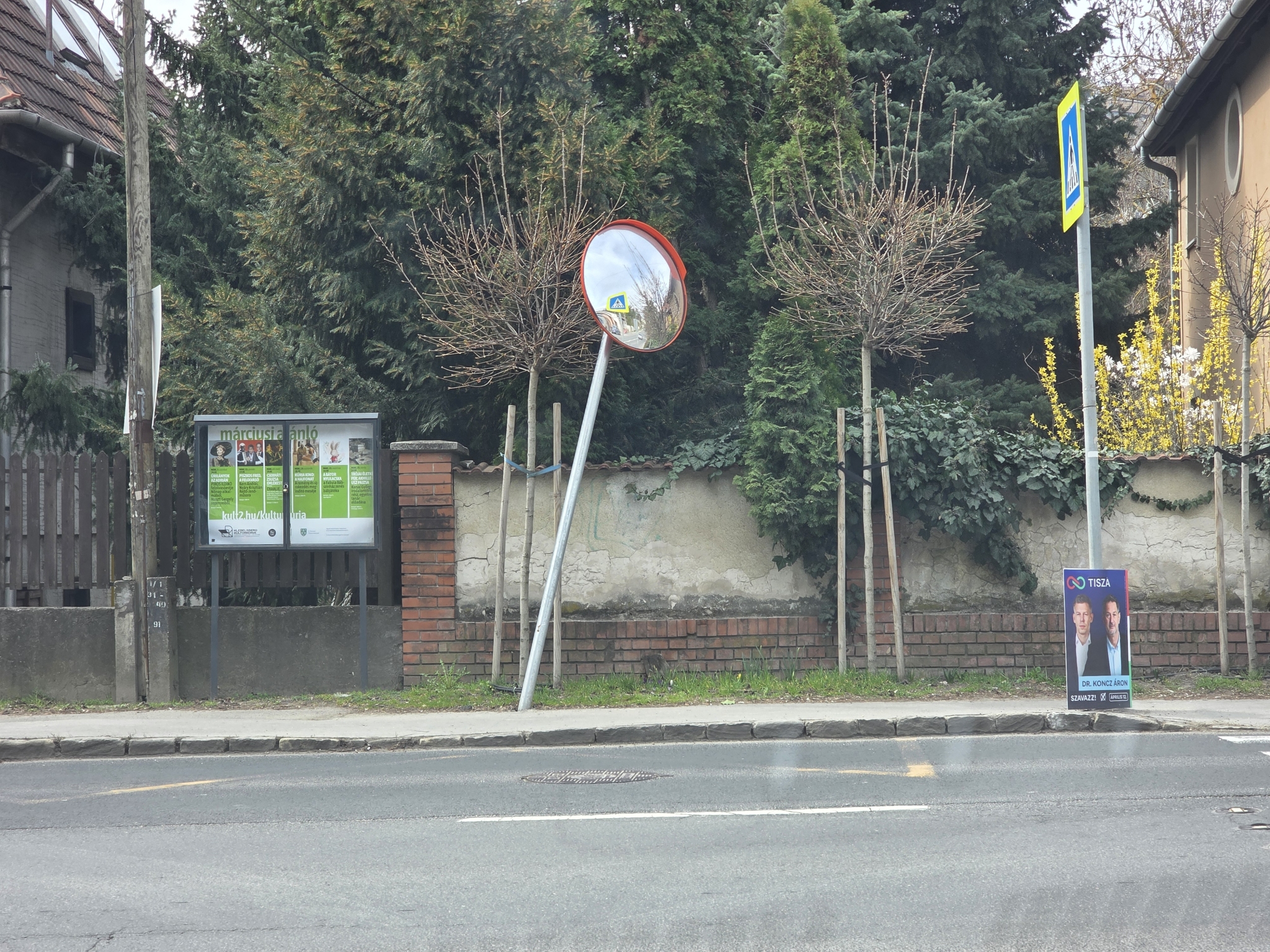 A Kerényi Frigyes utca aljában lévő zebránál megdőlt a tükör és eldordult a zebra jelző tábla. Javítását kérem.