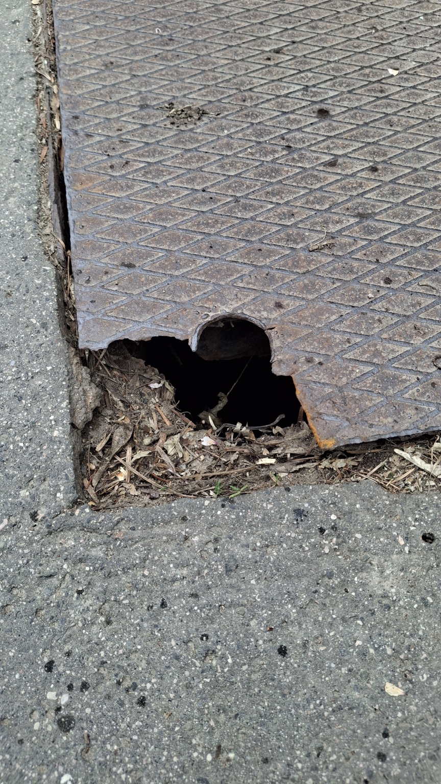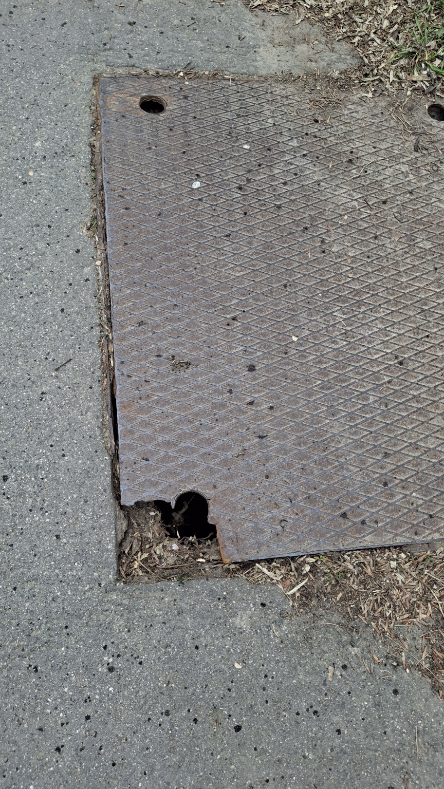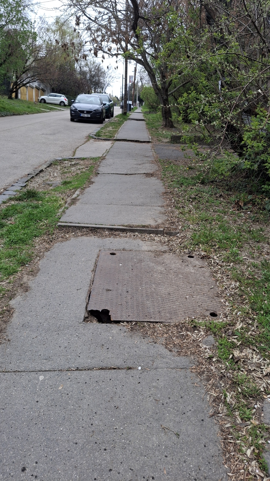 A járdán található aknafedél sarka annyira elrozsdásodott, hogy letört. Így az éles korrodált része baleset- és botlásveszélyes az arra járóknak.