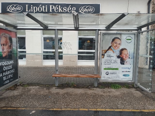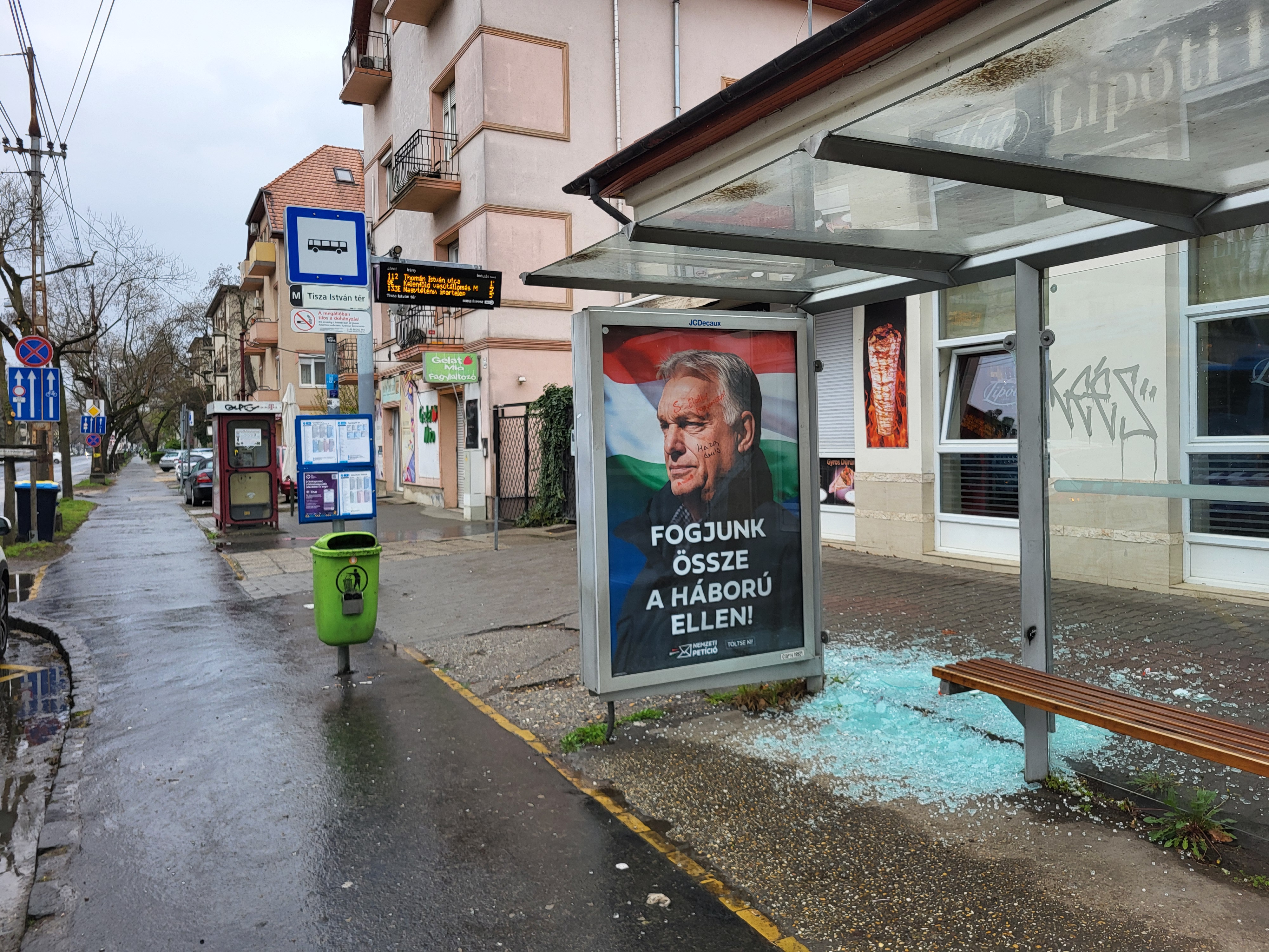 XIV. kerület Thököly út 148. előtt a buszmegálló üvege be van törve, üvegszilánkok a járdán szétszóródva.